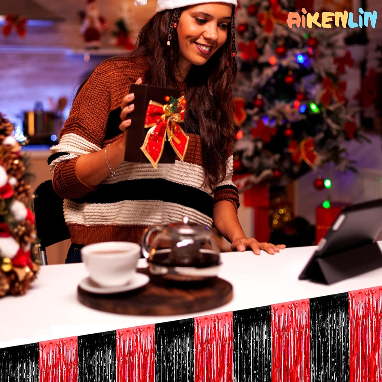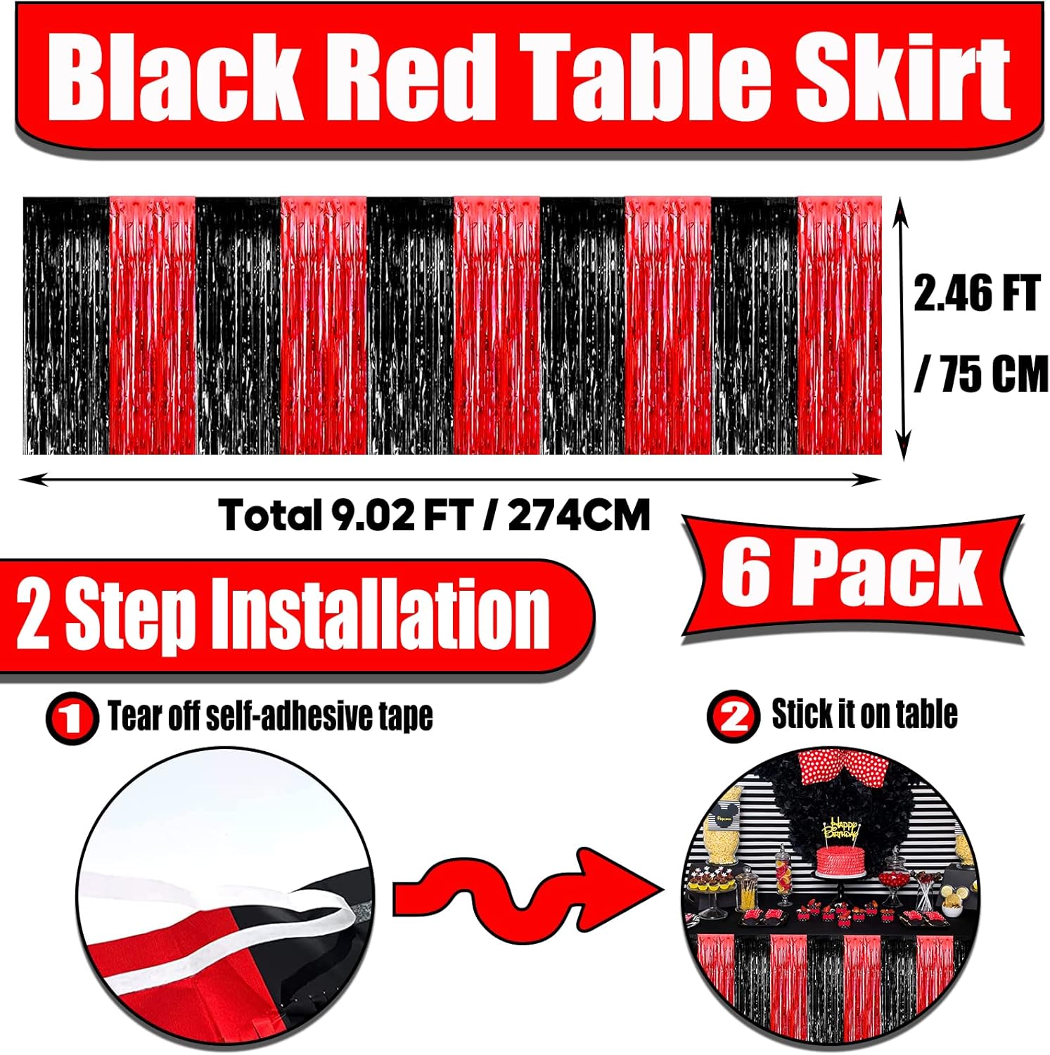 6 Pack 29x108 Inch Black Red Metallic Foil Fringe Tinsel Table Skirts for Rectangle Tables Streamer Curtains Backdrop for Wedding, Casino Viva Las Vegas Game Night Birthday Party Decoration