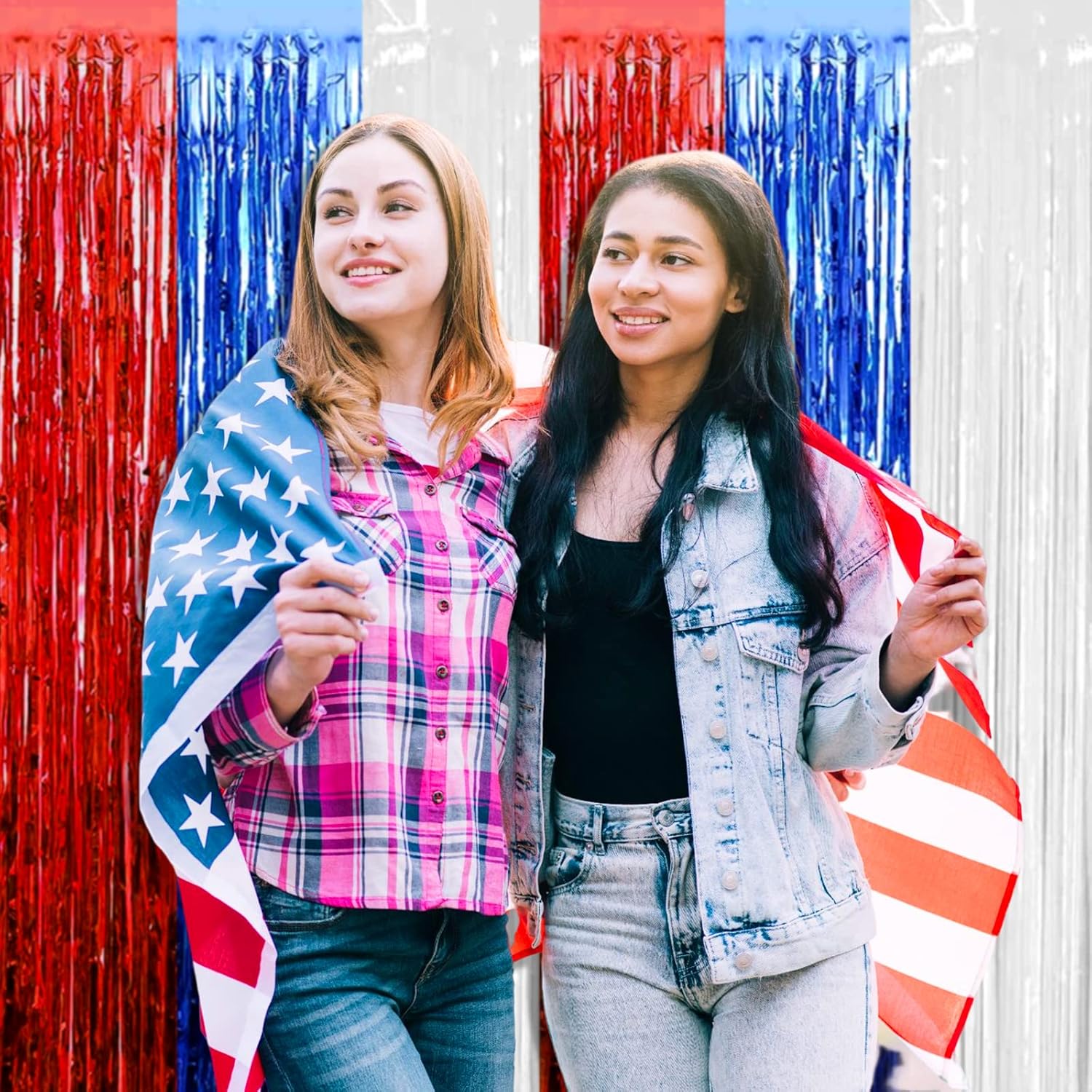 4 Pack Red Blue White Foil Fringe Curtain Backdrop, 3.28Ft x 9.8Ft Metallic Tinsel Foil Fringe Streamers Curtains for Photo Booth, Wedding, Mardi Gras, Birthday, Independence Day Party Decoration