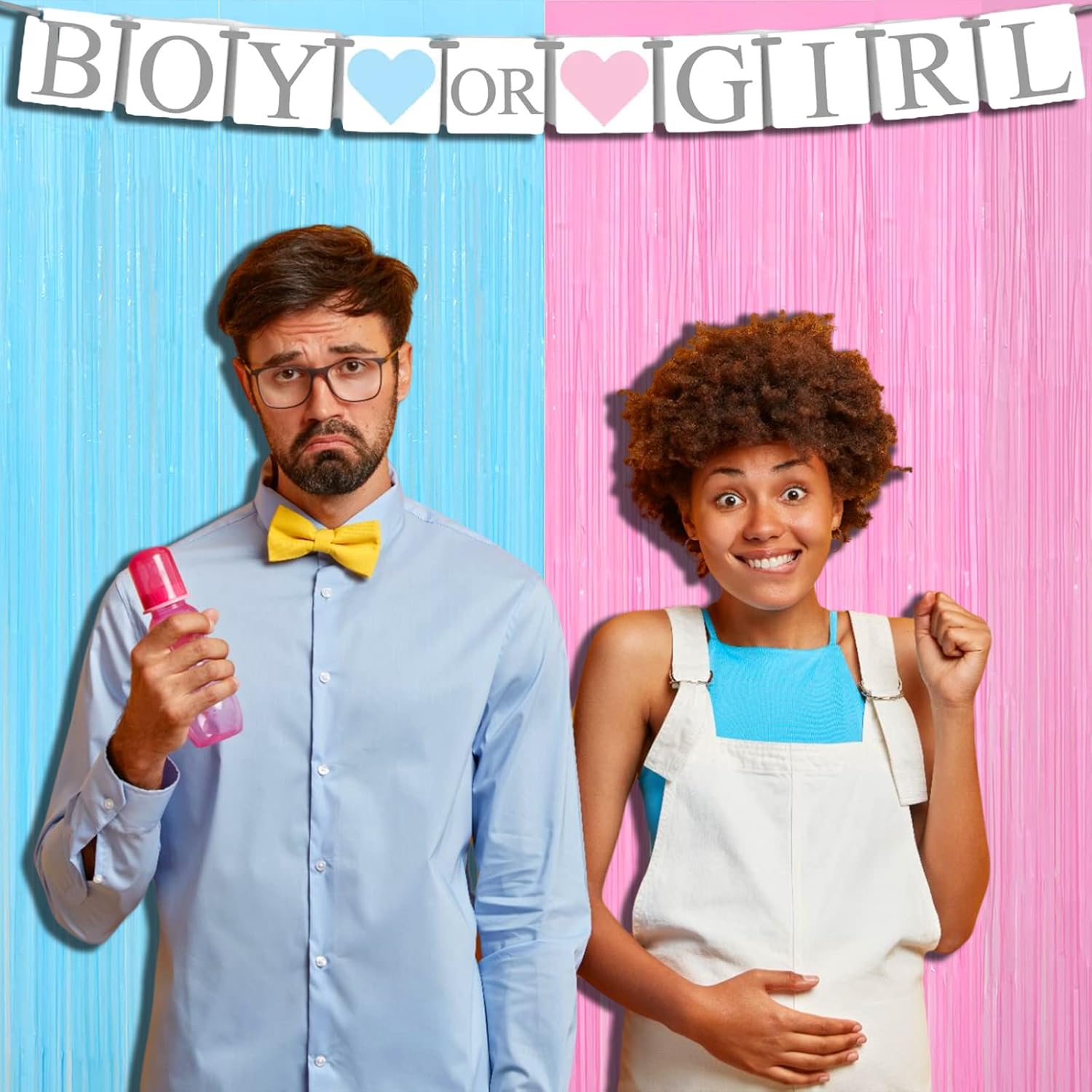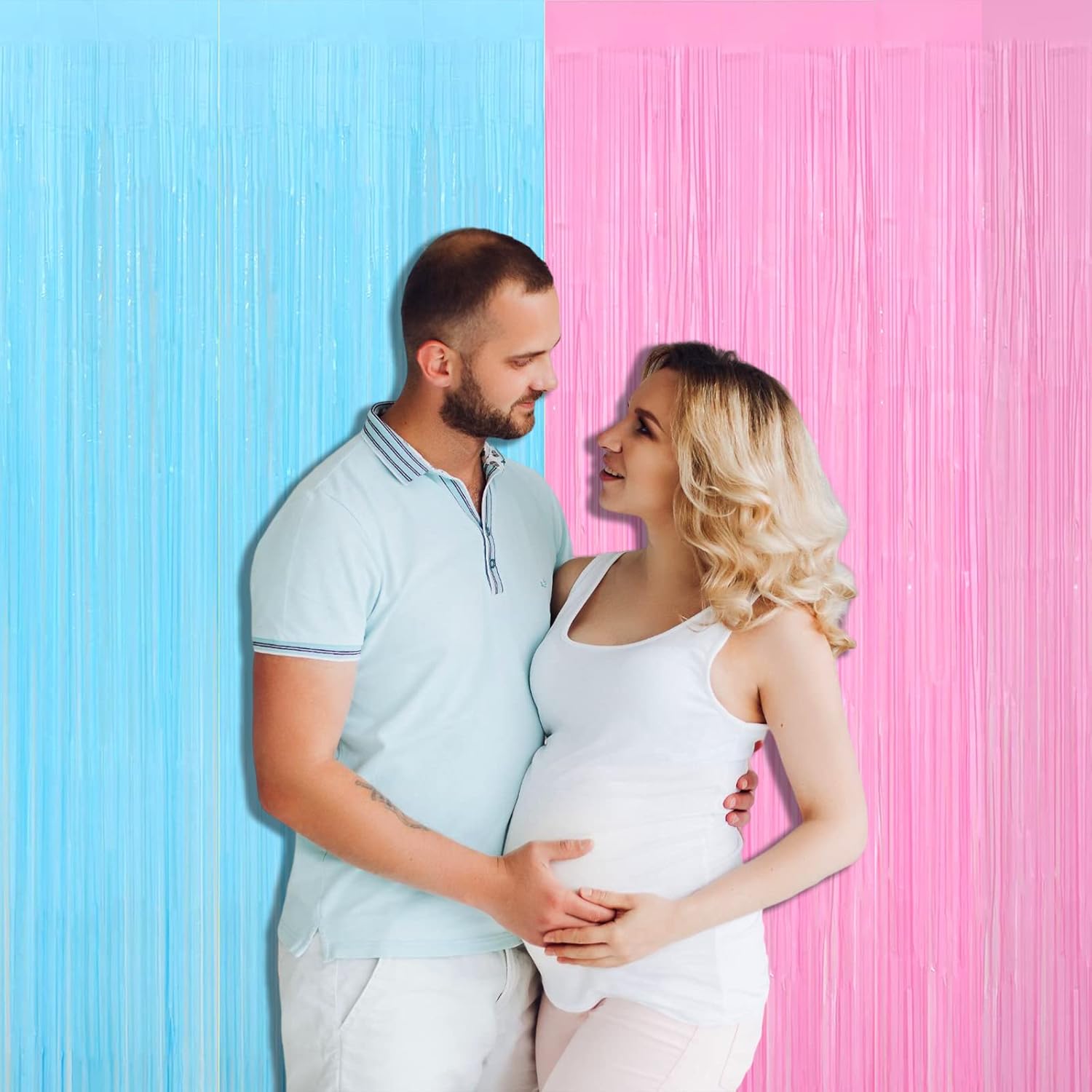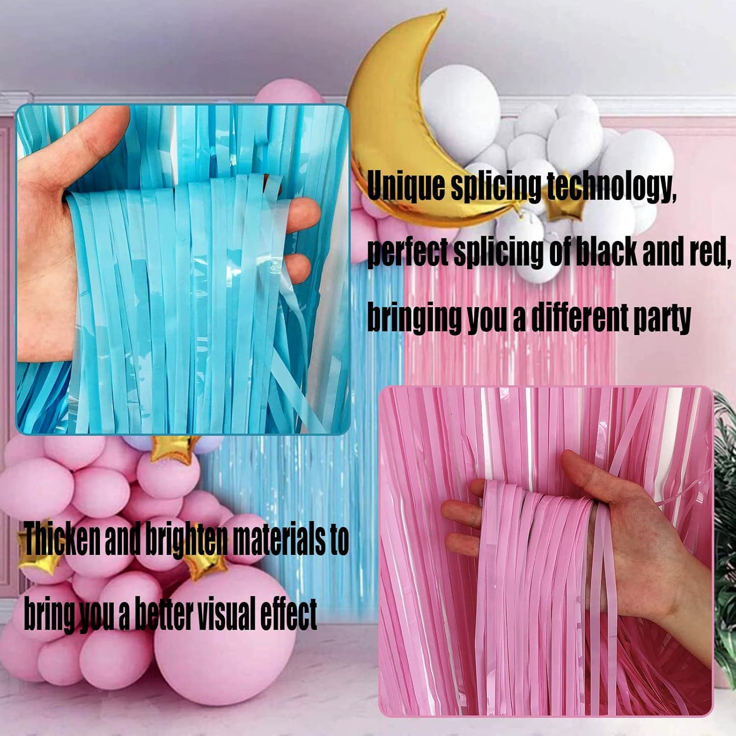4 Pack Macaron Pink Blue Foil Fringe Curtain Backdrop, 3.28Ft x 9.8Ft Metallic Tinsel Foil Fringe Streamers for Photo Booth, Wedding Gender Reveal Backdrop Boy or Girl Birthday Party Decoration
