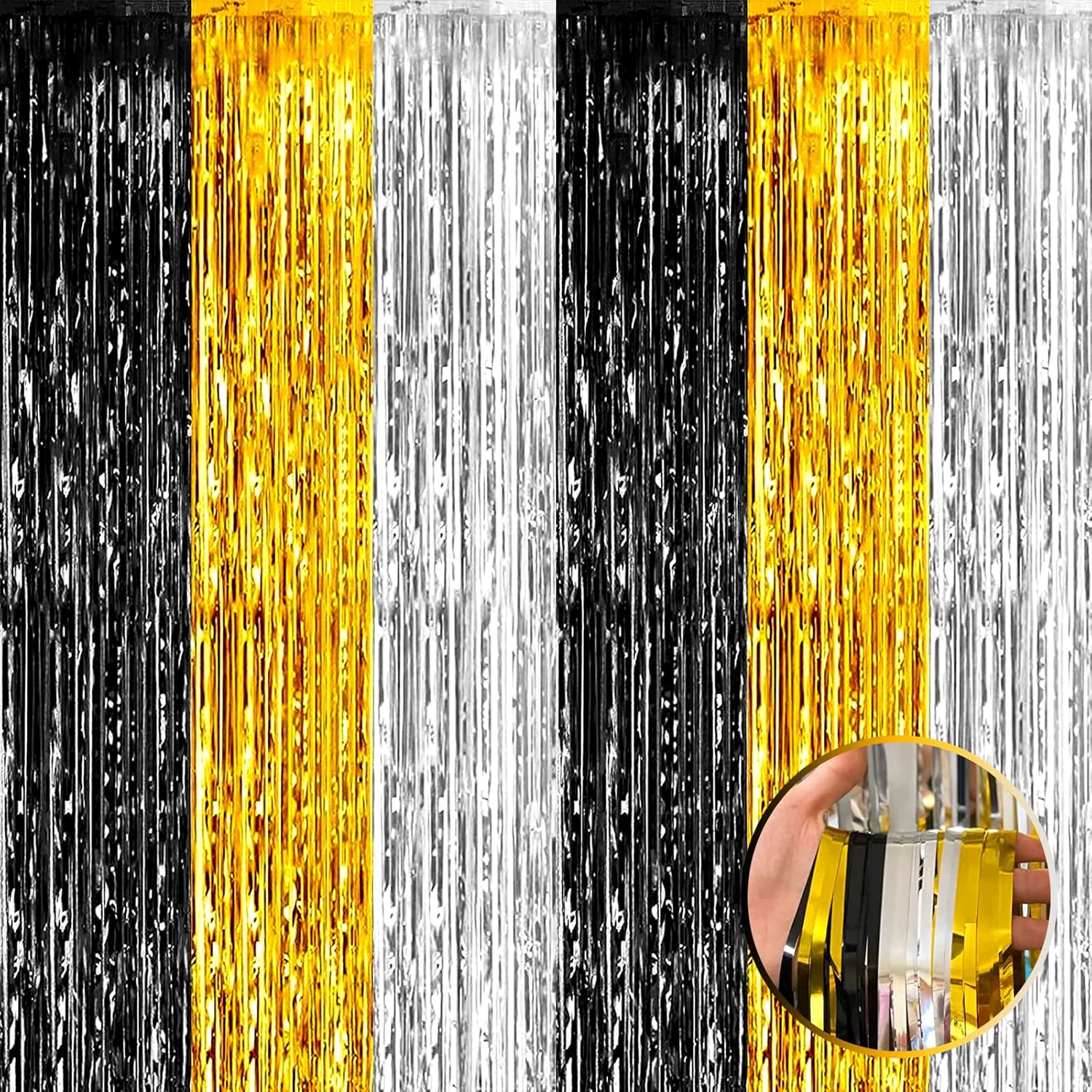 4 Pack Black Gold Silver Foil Fringe Curtain Backdrop, 3.28Ft x 9.8Ft Metallic Tinsel Foil Fringe Streamers for Photo Booth, Wedding, Notorious One Birthday Roaring 20s Graduation Party Decoration