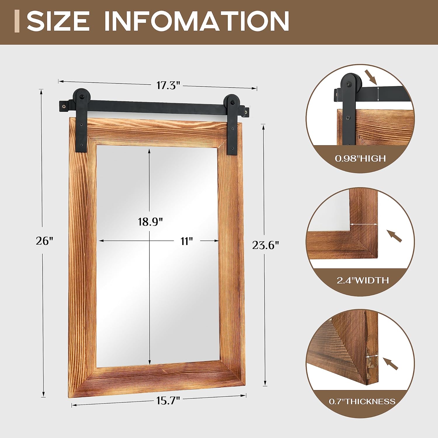 - EASY TO INSTALL: The overall size of this rustic mirror is 26 x 17.3 x 0.67 inch, and the display size of the mirror is 18.9 x 11 inch. The track is 17.3 inch. You can first fix the iron bracket on the mirror, then install the track on the wall, and finally the wheels on the iron bracket will be stuck into the track to complete the hanging