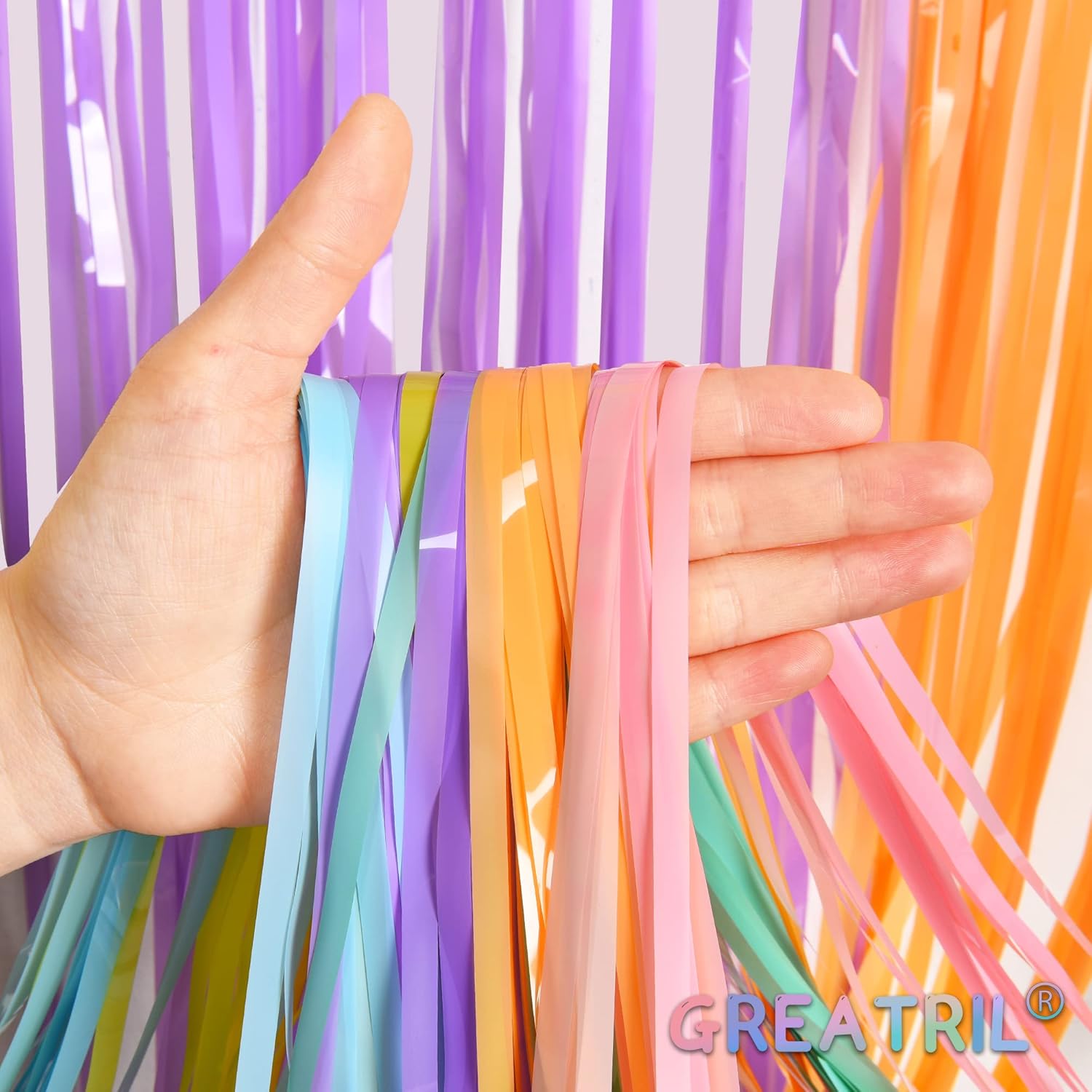 - Pack of 2, Greatril 3.2 ft x 8.2 ft rainbows pastel foil fringe tinsel curtain doors streamers party decorations. It is a pastel color, including six colors: orange, cyan, light pink, light blue, yellow and light purple. They are very romantic and dreamy color.