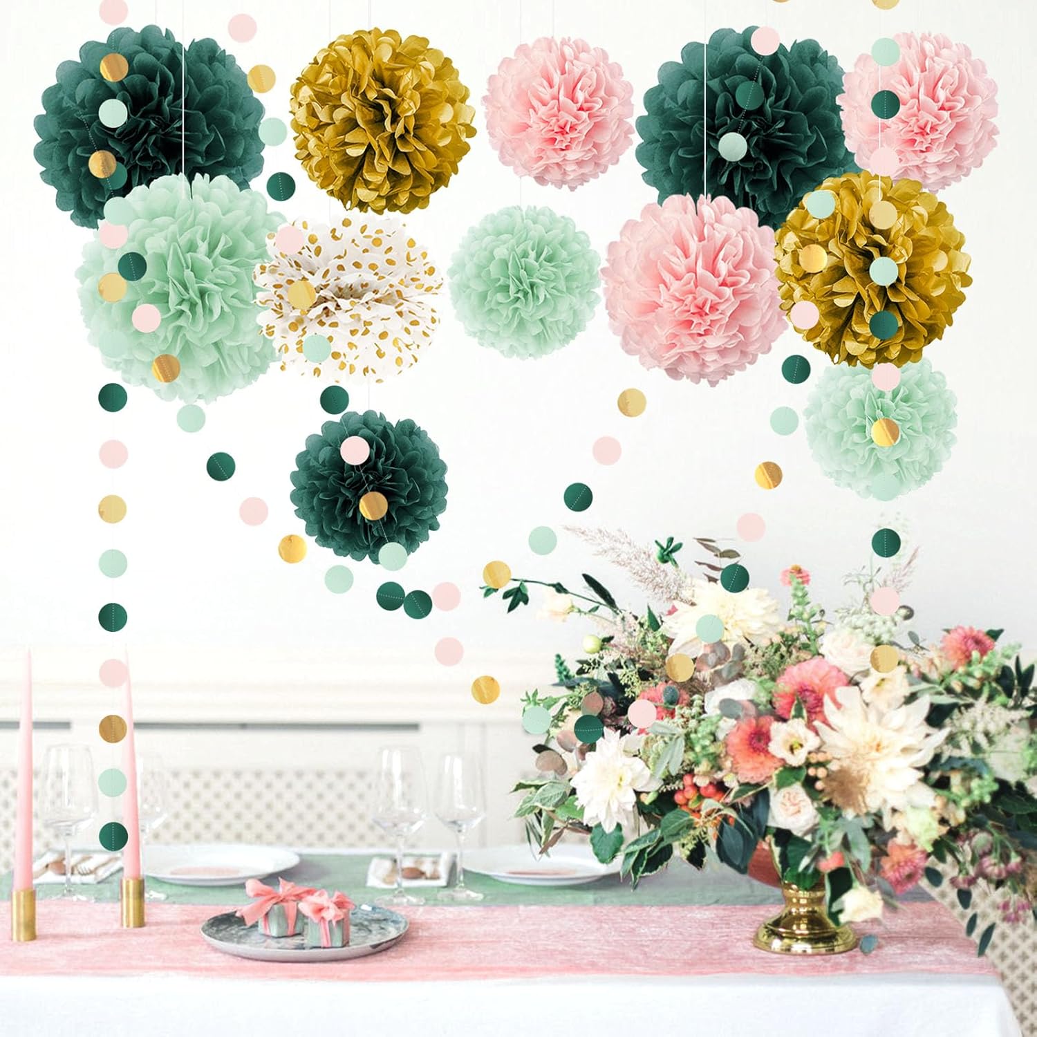 AOBKIAT Wedding Birthday Party Decorations Set,15PCS Sage Green Pink Tissue Paper PomPoms Circle Dots Paper Garland String Hanging Backdrop for Baby Shower, Boho Bridal Wedding Theme Decor
