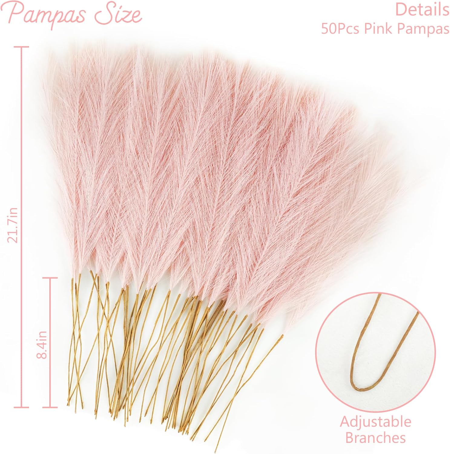 - Pink Pampas Grass Decor: You will get a pack of 50pcs artificial pampass grass, each stem 21.6β, and the heads of each stem is designed you can fluff them up for a fuller look, create a chic minimalist, or Bohemian modern display to complement your existing home arrangement