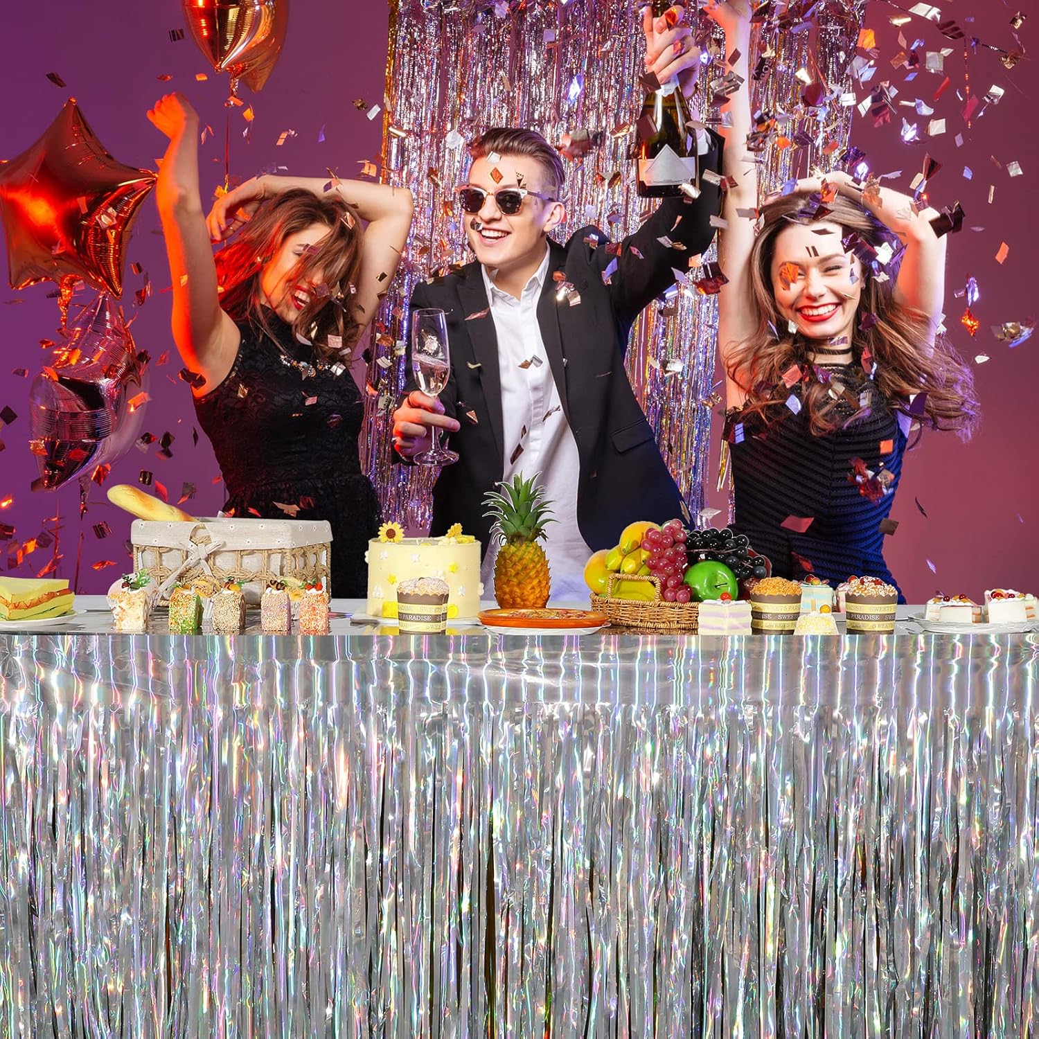 8 Pack Iridescent Table Skirt, Metallic Foil Fringe Tinsel Table Skirts for Rectangle Tables, Disposable Laser Rainbow Table Skirt Iridescent Party Decorations for Birthday Wedding Holiday, 29x108Inch
