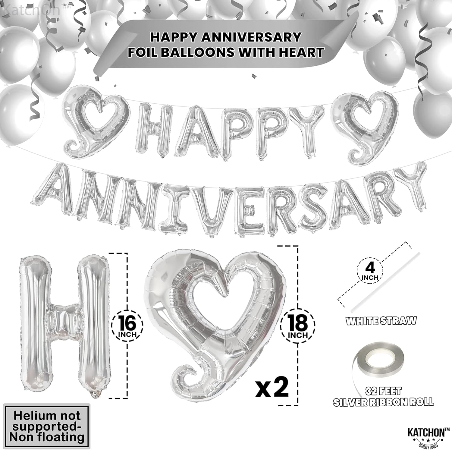 - SELF SEALING - 18 INCH | EASY TO INFLATE โ This giant silver happy anniversary balloon pack that comes with a Happy anniversary silver balloon banner, 18 pieces. Designed with big 16 inchโ foil letters, 18 Inch silver heart balloons, this silver happy anniversary sign silver lets celebrate special moments with children, friends, and family. Happy wedding balloons are self sealing, holding air for long time. Add sparkle to Silver anniversary celebration with our Happy anniversary ballons.