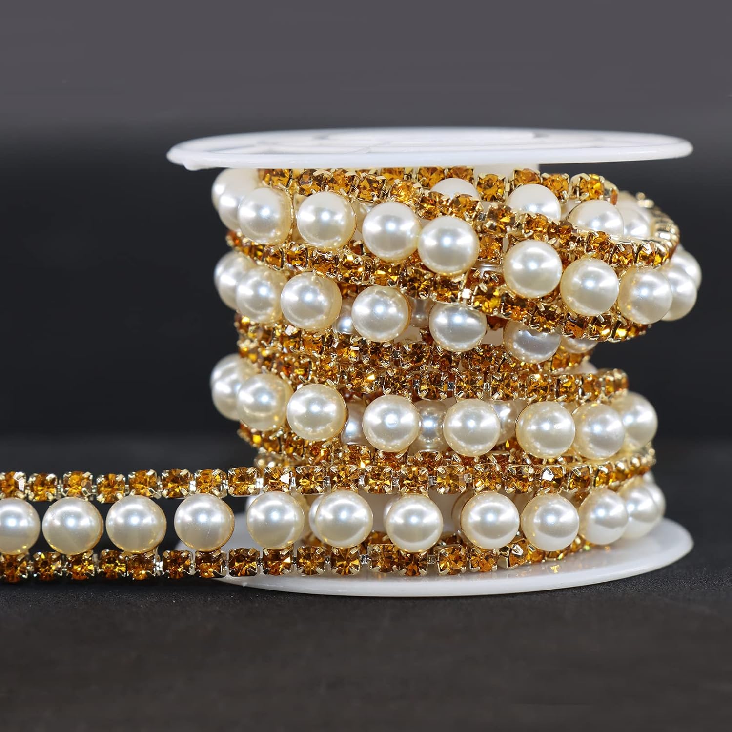 Jerler Gold Rhinestone Trim Applique 1 Yard 2 Rows Crystal Chain Banding Diamond Inlaid White Pearl Beaded Rhinestones for Crafts Clothing and Bridal Embellishments Wedding Ideas Christmas Decorations