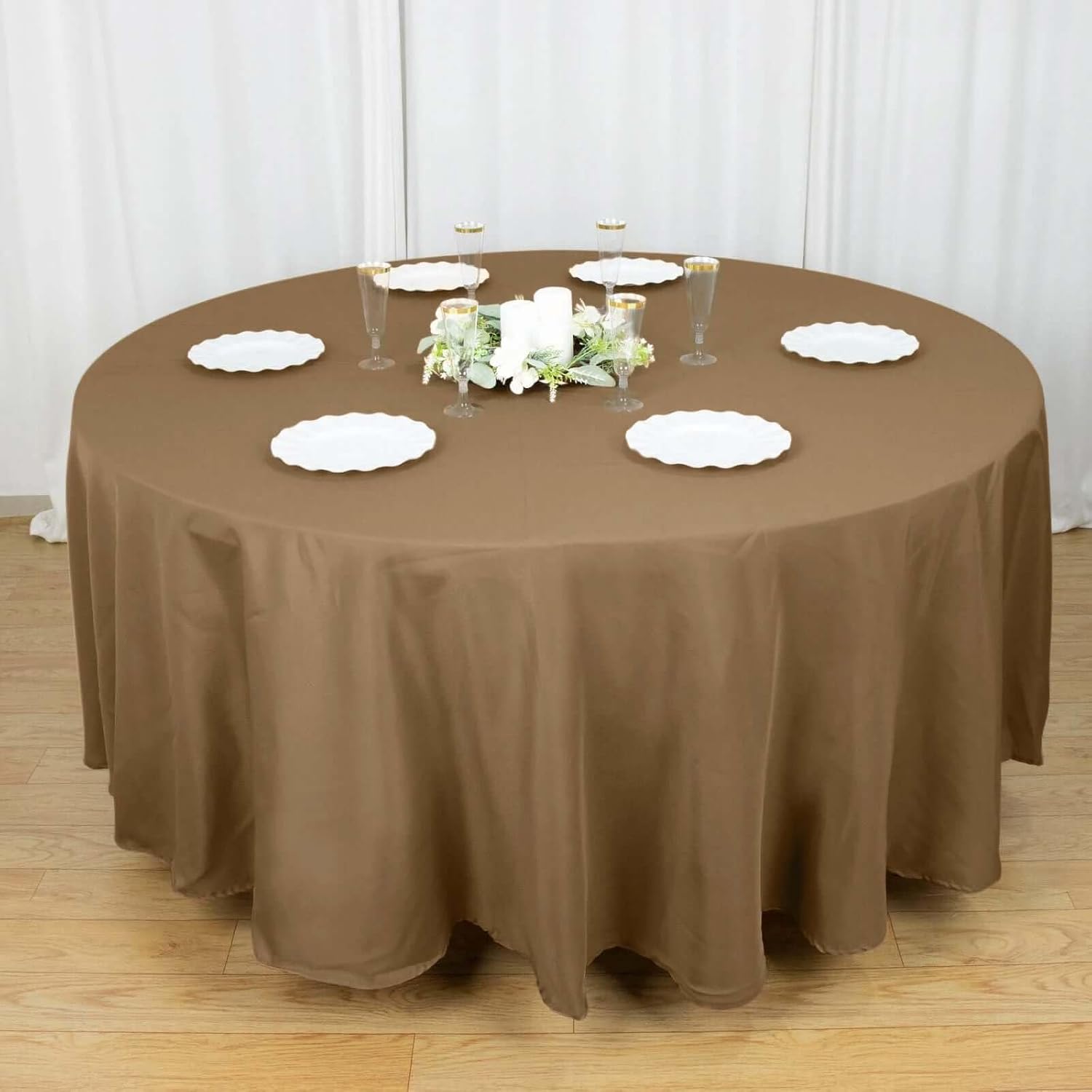 - Quantity: 1 Tablecloth Material: Polyester Color: Taupe Size: 108" Round Thickness: 200 GSM 1 piece, seamless design. Features: Stain & Wrinkle Resistant, Machine Washable Hemmed edges for an exquisite look. Gives floor length hang on standard 4ft (48") tables.