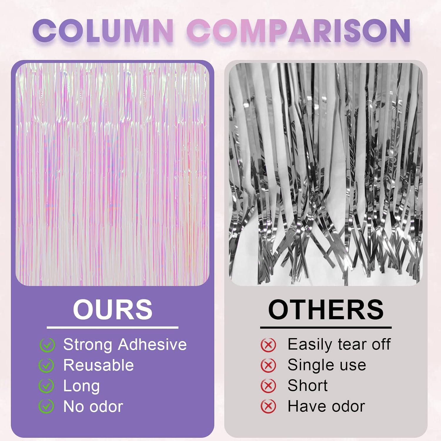 - Package Included: 4 packs of foil fringe curtains, the size of the foil curtain is 3.3*8.2 ft. It's long enough to fit any occasion. Please do not stick the foil curtain on uneven or stained walls to prevent it from falling off
