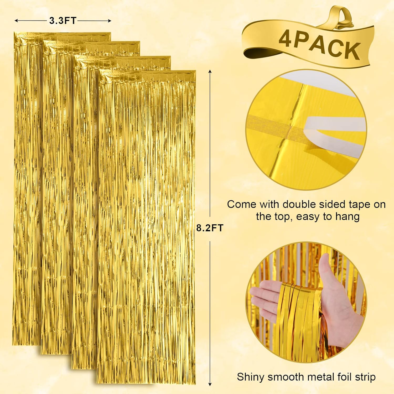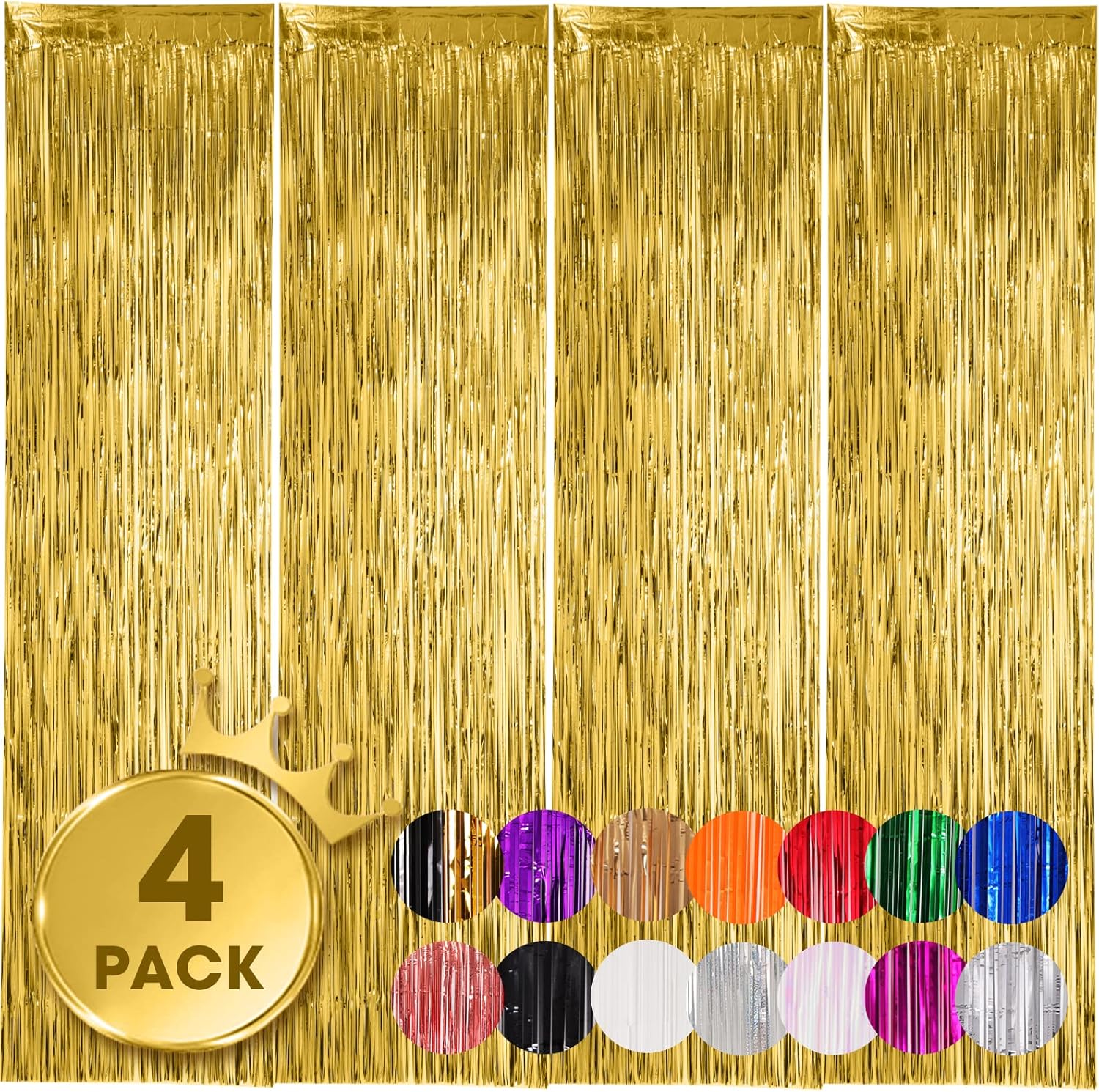 4 Pack Gold Foil Fringe Backdrop Curtains, Tinsel Streamers Birthday Party Decorations, Fringe Backdrop for Graduation, Baby Shower, Gender Reveal, Disco Party