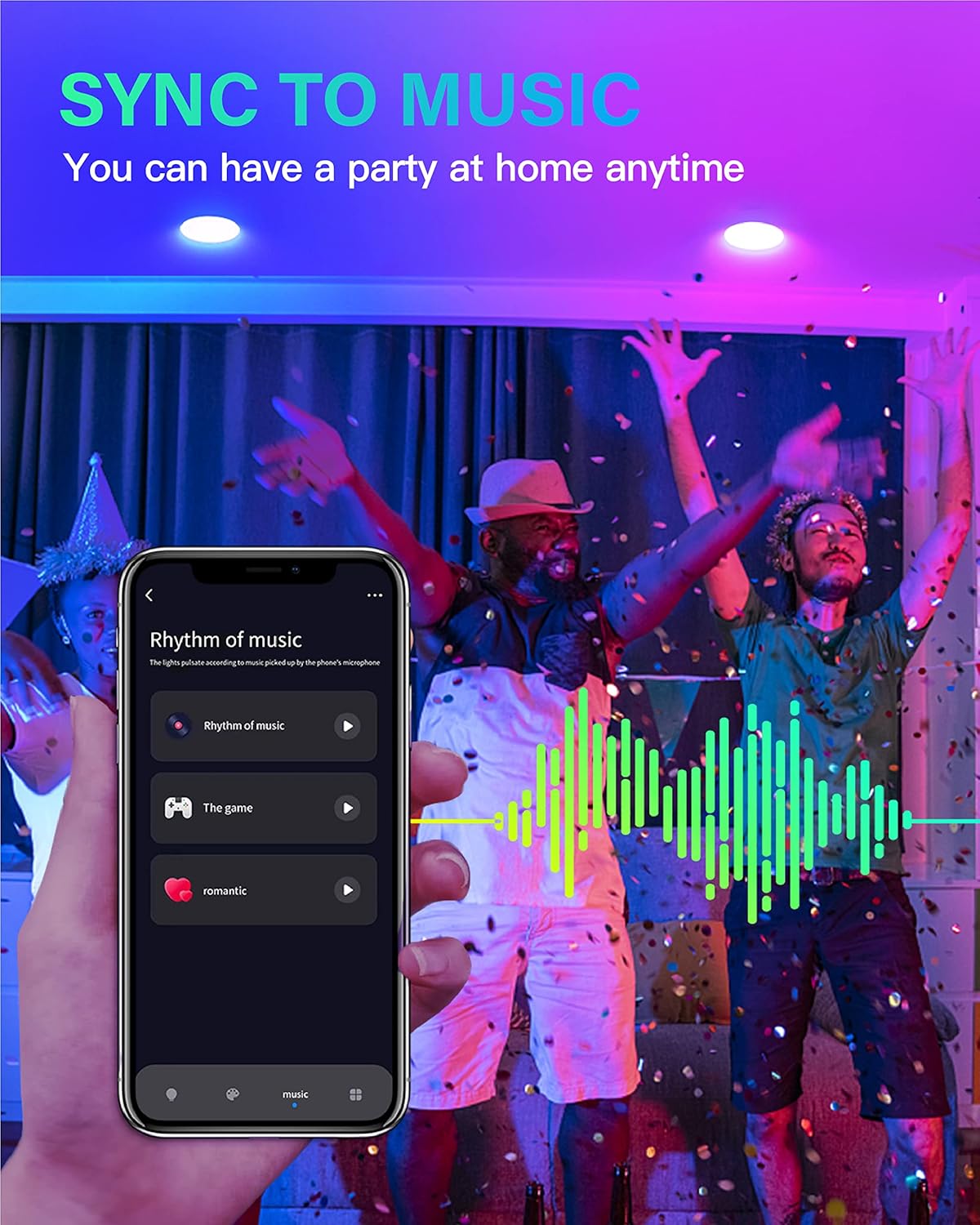 - 【Music & Mic Snyc】 Want to have a music party at home? Then use this smart ceiling light, you can change the color of the light according to the beat of the music, so that you can also enjoy the fun of music party at home.