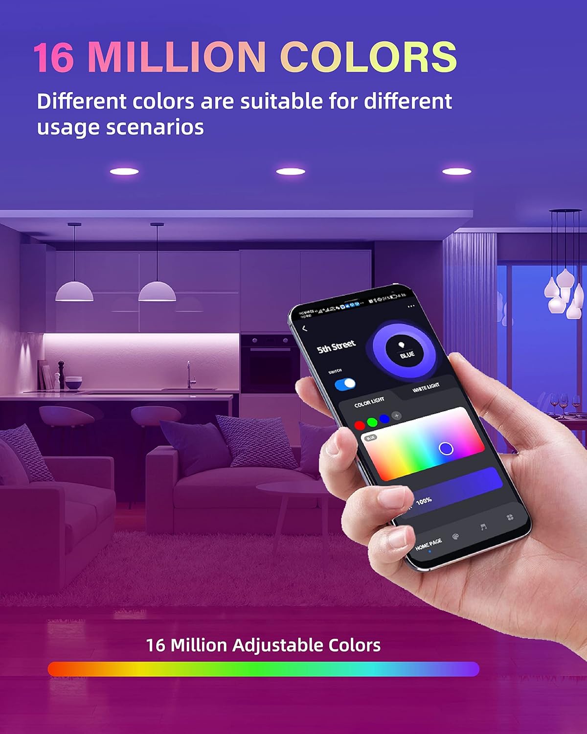 - 【Variety of Colors & Brightness】 The 4 inch smart recessed downlight supports warm white and cool white from 2700K to 6000K. Provide 16 million colors. 5%-100% brightness is adjustable. 8 scene modes, you can also DIY the scene modes you want.