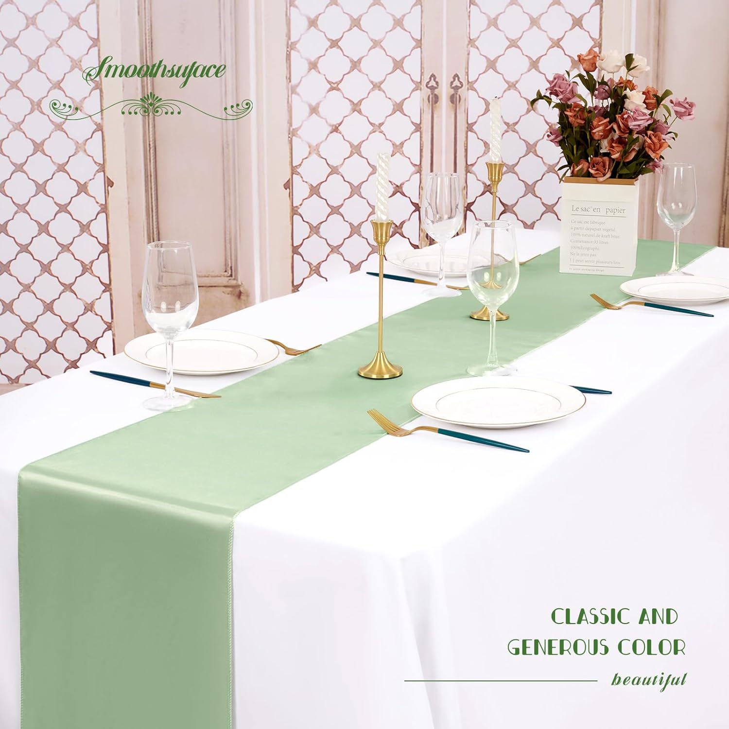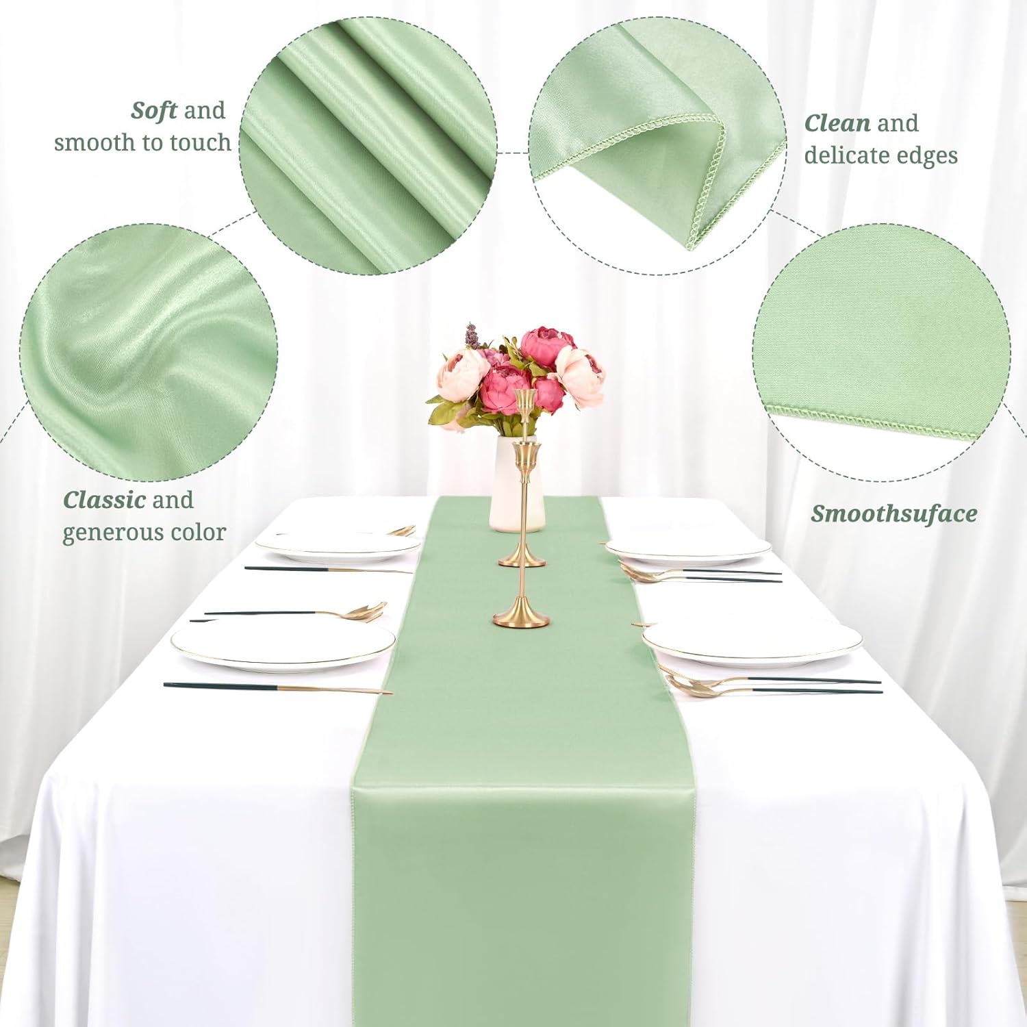- đăPerfect FinishăSage satin table runner is made of delicate satin with smooth appearence.Neat seams with a clean look.Seamless, wrinkle-free, lightweight.Our satin table runners feature a refined, a solid color with an exquisite satin sheen that creates simple elegance.The seamless one-piece design making your party decorations shine when you add this silky-smooth runner on your table top.It's a great way to make your centerpieces and candles pop!