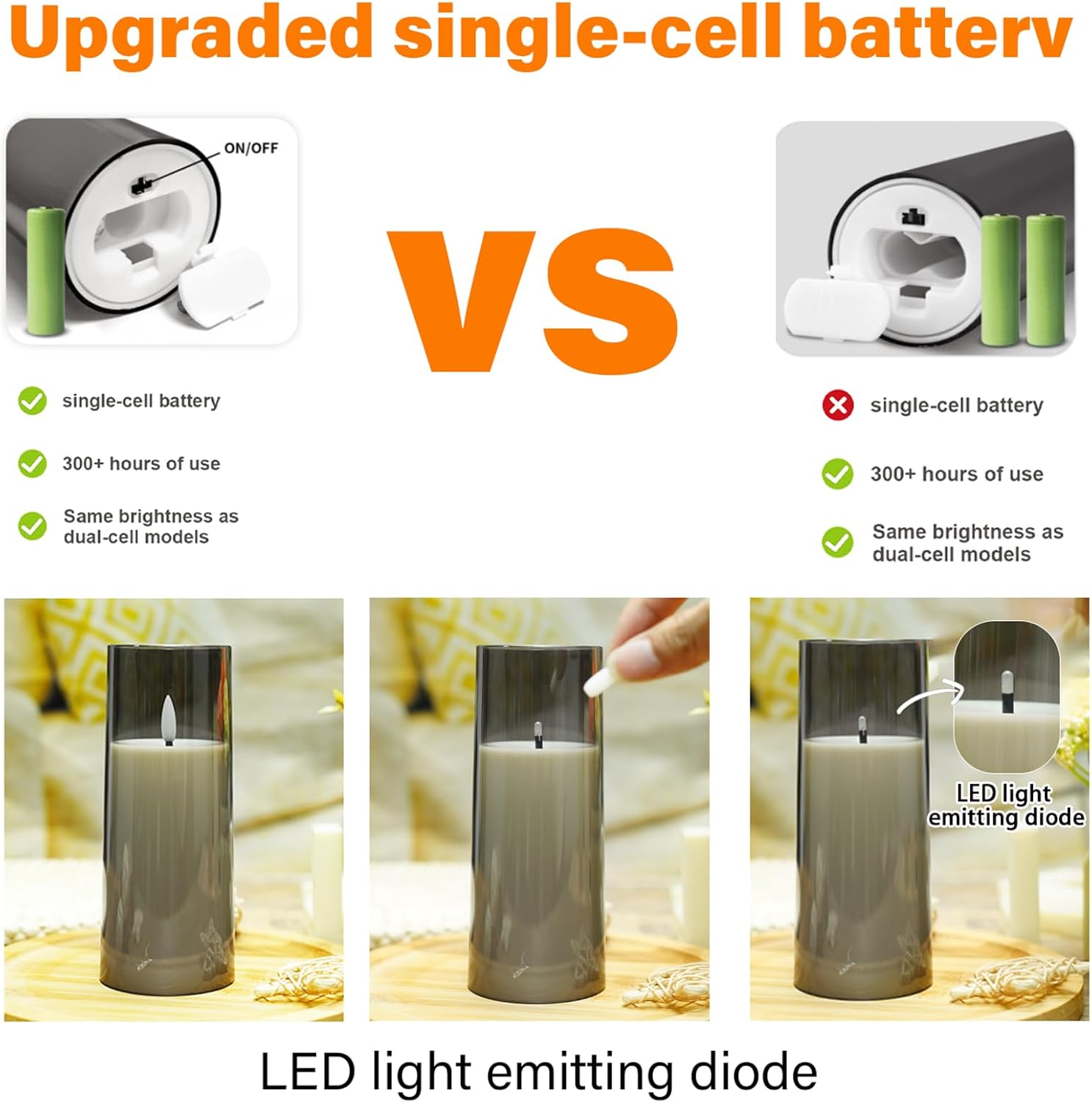 - UPGRADED VERSION - SINGLE BATTERY:Introducing our flameless candles with an advanced battery technology that lasts over 300 hours on just one single battery! That's right, unlike other brands that require two batteries, our candles are powered by only one battery without compromising on brightness. Not only is this energy-saving feature practical and convenient, but it also makes our candles a cost-effective choice.Per battery candle is powered by 1 x AA batteries (Not included).