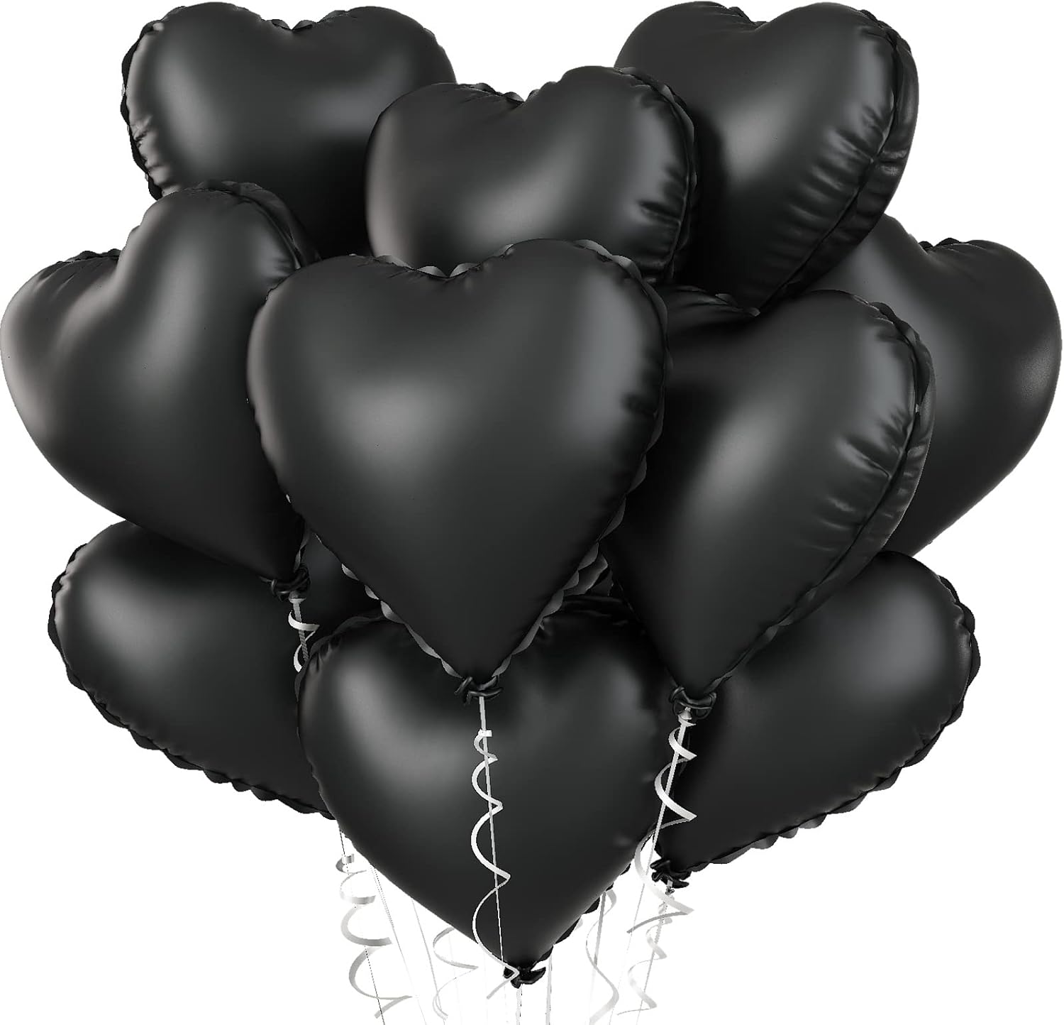 - π 10 PCS BLACK FOIL HEART BALLOONS: Package contains 10 x 18 inch black heart balloons, 1 x 10m ribbon.The black heart shape balloons are specially shaped, the perfect size for your holiday or party decorating needs, together create a fun and surprising party, leave an unforgettable smile!