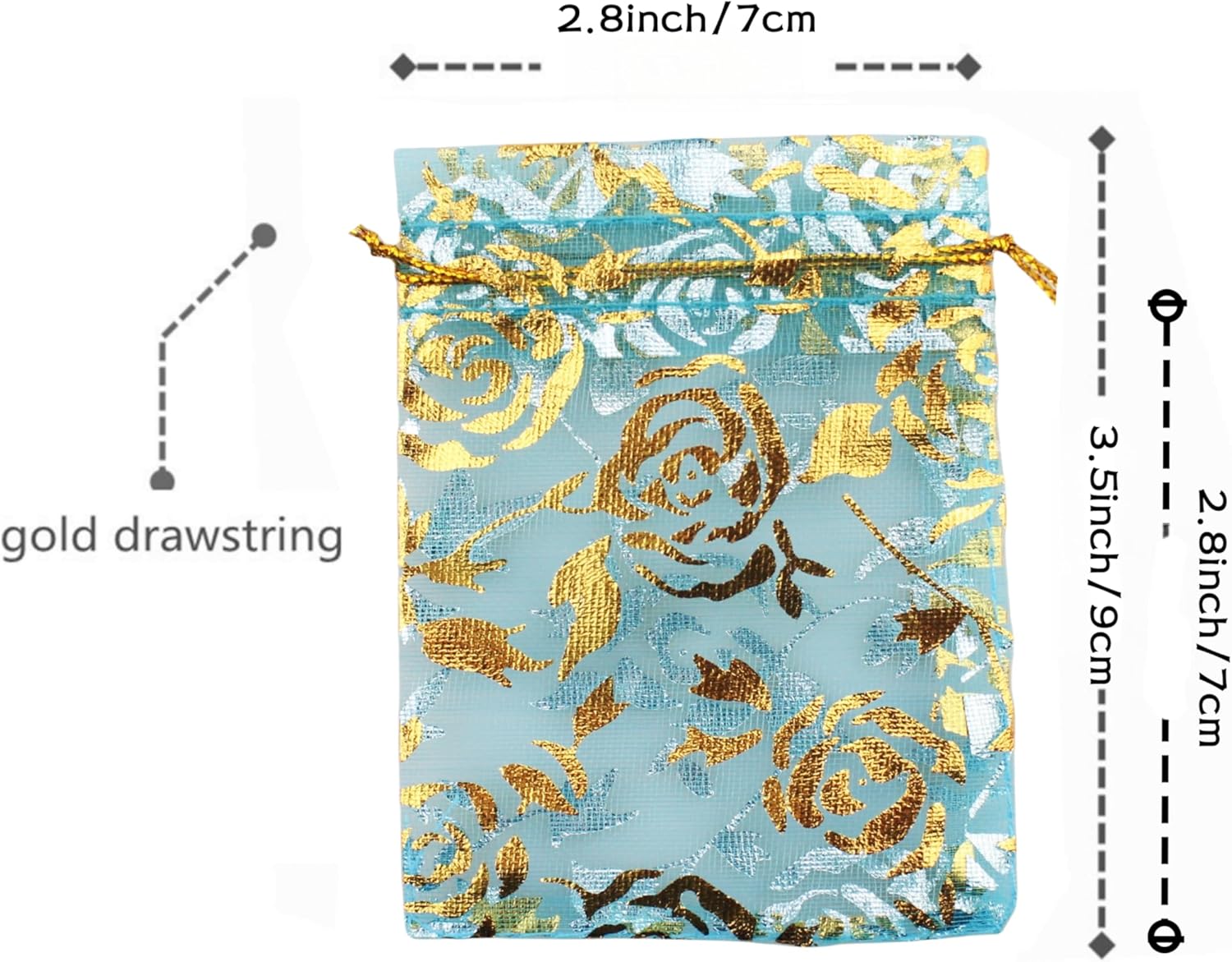 100 Pack 2.8 x 3.5 Inch Flower Heart Organza Jewelry Gift Pouch Candy Pouch Drawstring Wedding Favor Bags B511S (turquoise gold flower)