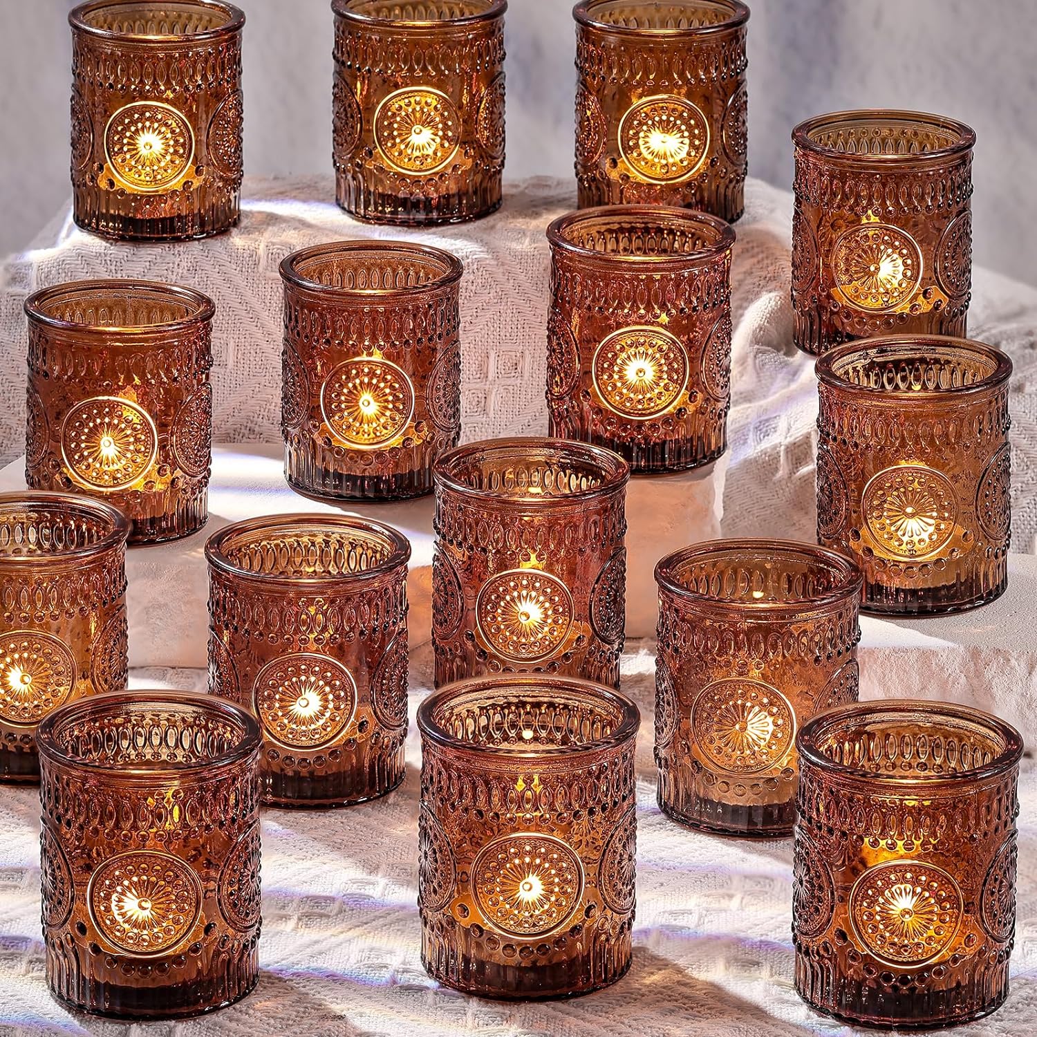 DARJEN Amber Votive Candle Holders Set of 36- Glass Candle Holders Bulk for Flameless LED Tea Waxes, Vintage Candle Holder for Wedding & Home Table Decor, Vintage Parties