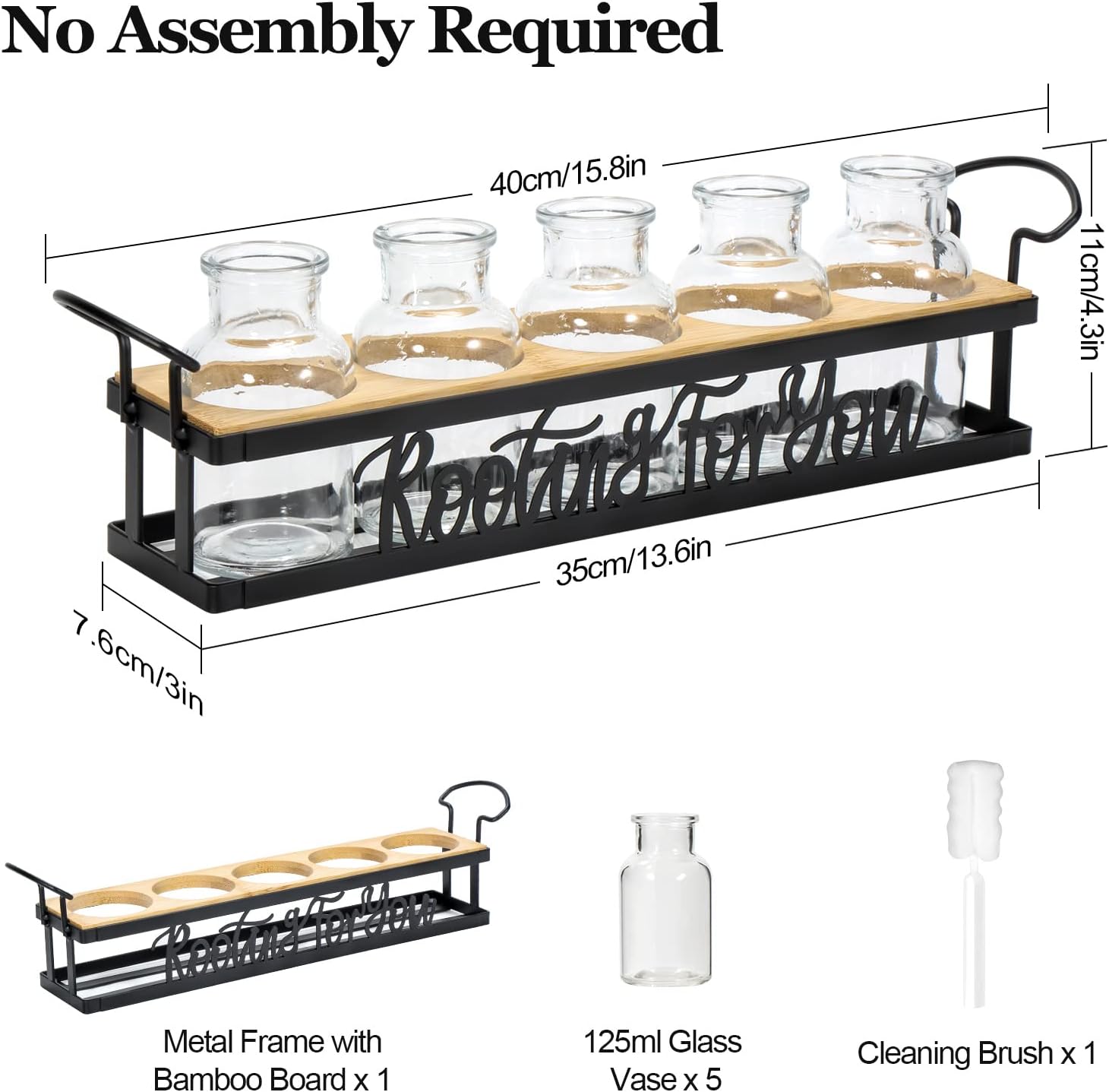 - No Assembly Required: The propagation kit is already assembled and ready to use. Package Includes: 1 x black metal stand with board, 5 x 4.4 oz bottles, 1 x cleaning brush. Note: Plants Not Included. If any part of your received item is less than perfect, please let us know, we will do our best to solve the problem within 24 hours