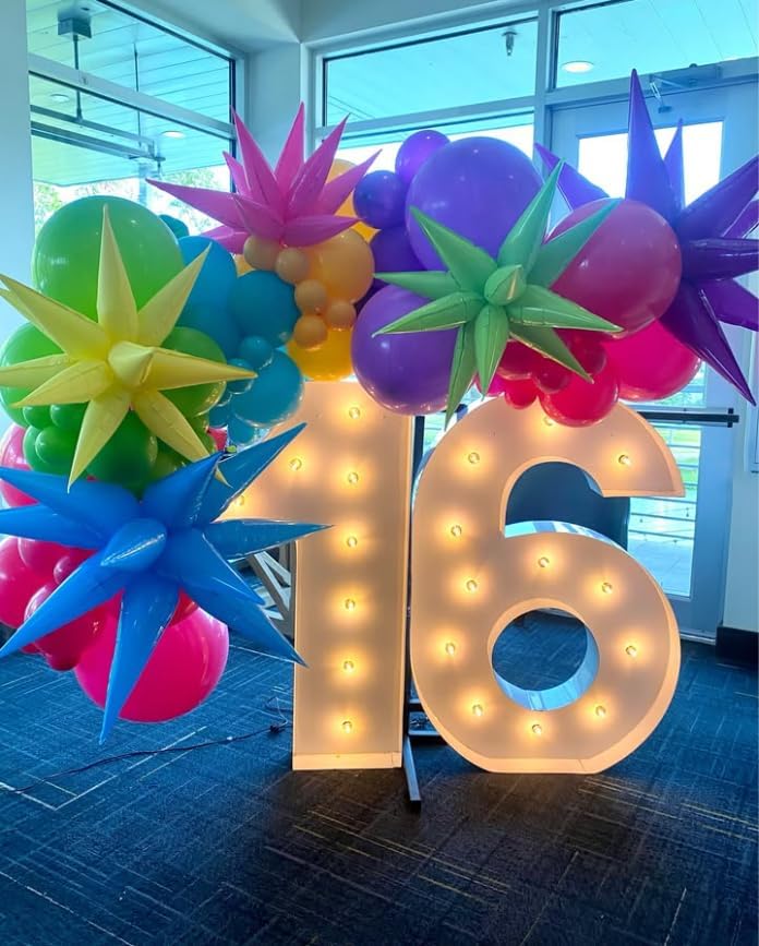 - Packing list:balloon:36pcs cone shaped balloons (12pcs cone balloons can make 1pc explosion star balloon = 3 pcs 3D foil explosion stars ) + accessories:1pc ribbon