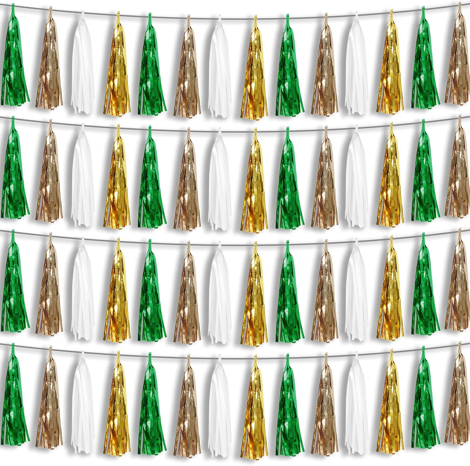 - 【Reusable Tassel Garland Material】: high-quality metallic foil tassel garlands, with the virtue of nice craftsmanship and lightweight, they are reusable and safe, and not easy to fade; They come with white ribbon for hanging, and garland tassels hang perpendicular to the string, and are adjustable to provide you with the option of spreading the tassels out or piecing them closer together.