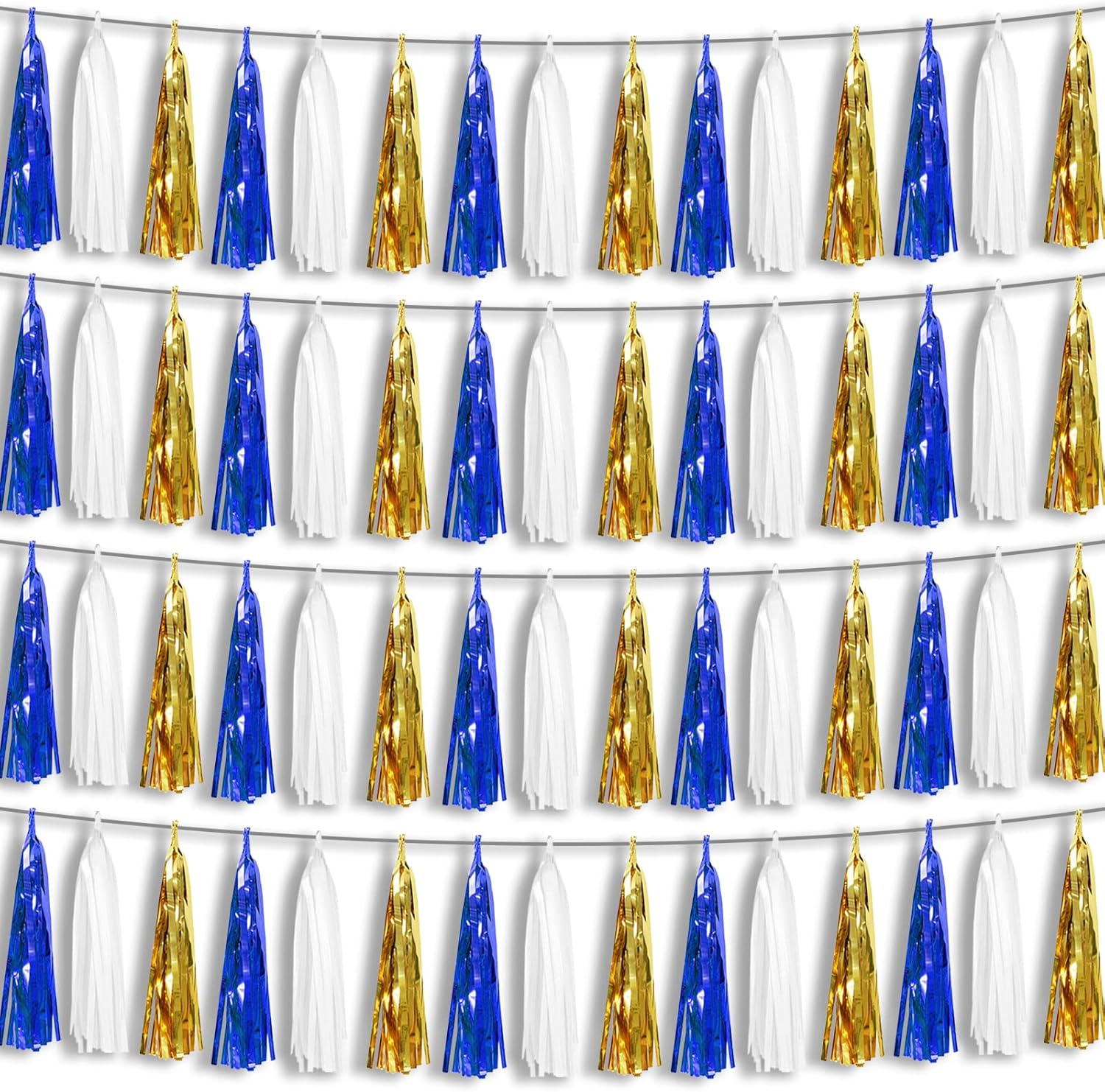 4P Navy-Blue White-Gold Foil Fringe Metallic Tassel-Garland, Tassels Banner Streamers for Parade Floats, Bachelorette, Wedding, Birthday, Halloween, Christmas, Bridal/Baby Shower Party Decorations