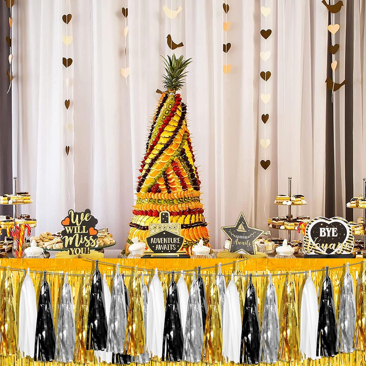 - 【Applicable Occasions】you can use the navy blue white gold tinsel fringe garlands to decorate a classroom, the stage for a school program, a homecoming float, a wedding decoration, a birthday party, a baby shower, Halloween, Christmas, new year's Eve, a housewarming party, a bachelorette party, an anniversary Memorial, Hollywood Party, Independence Day, Carnival Party, Bridal Shower, Graduation and more.