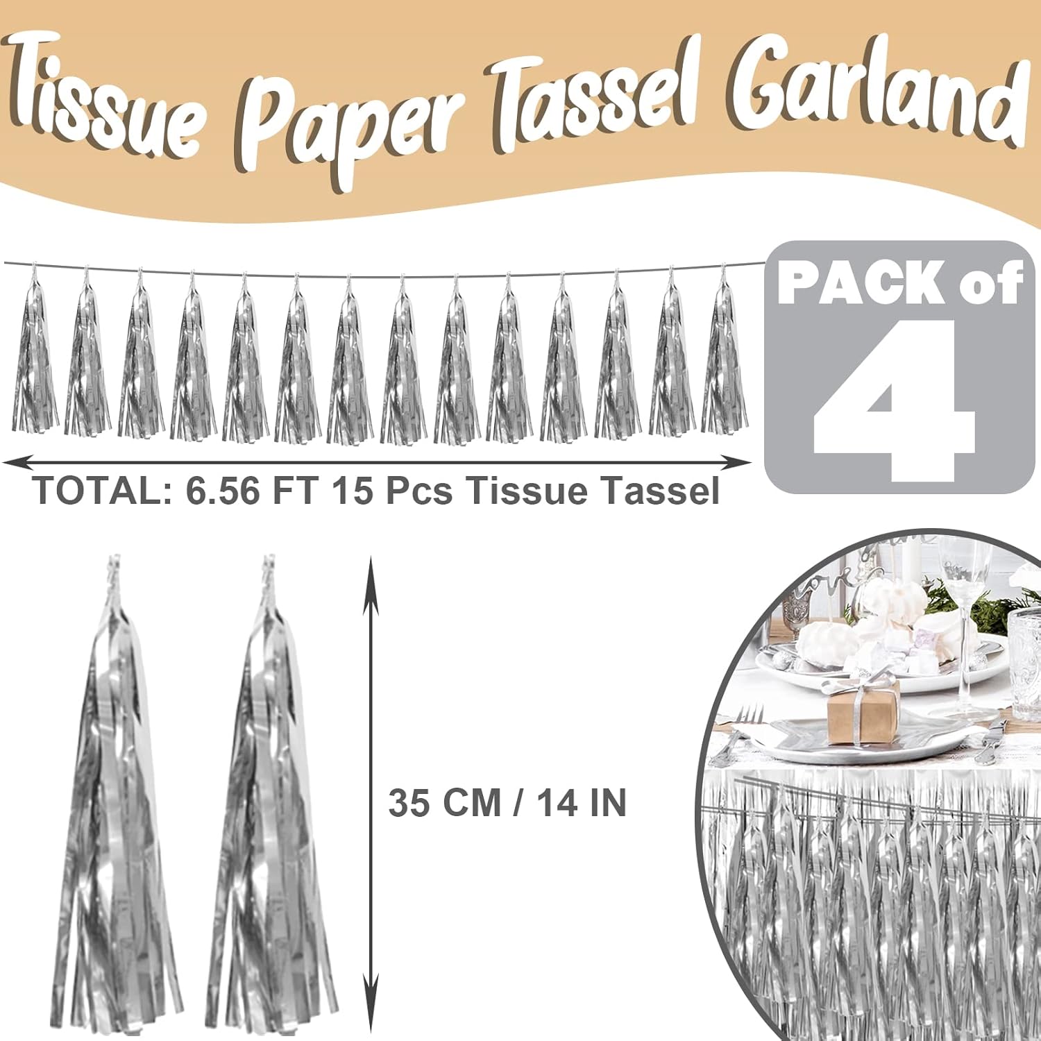 - 【Silver Party Supplies Set】: The total length of the silver birthday tassels banner is 26.2 feet, divided into 4 strips, each 6.5 feet long. Each banner contains 15 tassels, and each tassel measures 14 inches, for birthday decorations many occasions, and so on