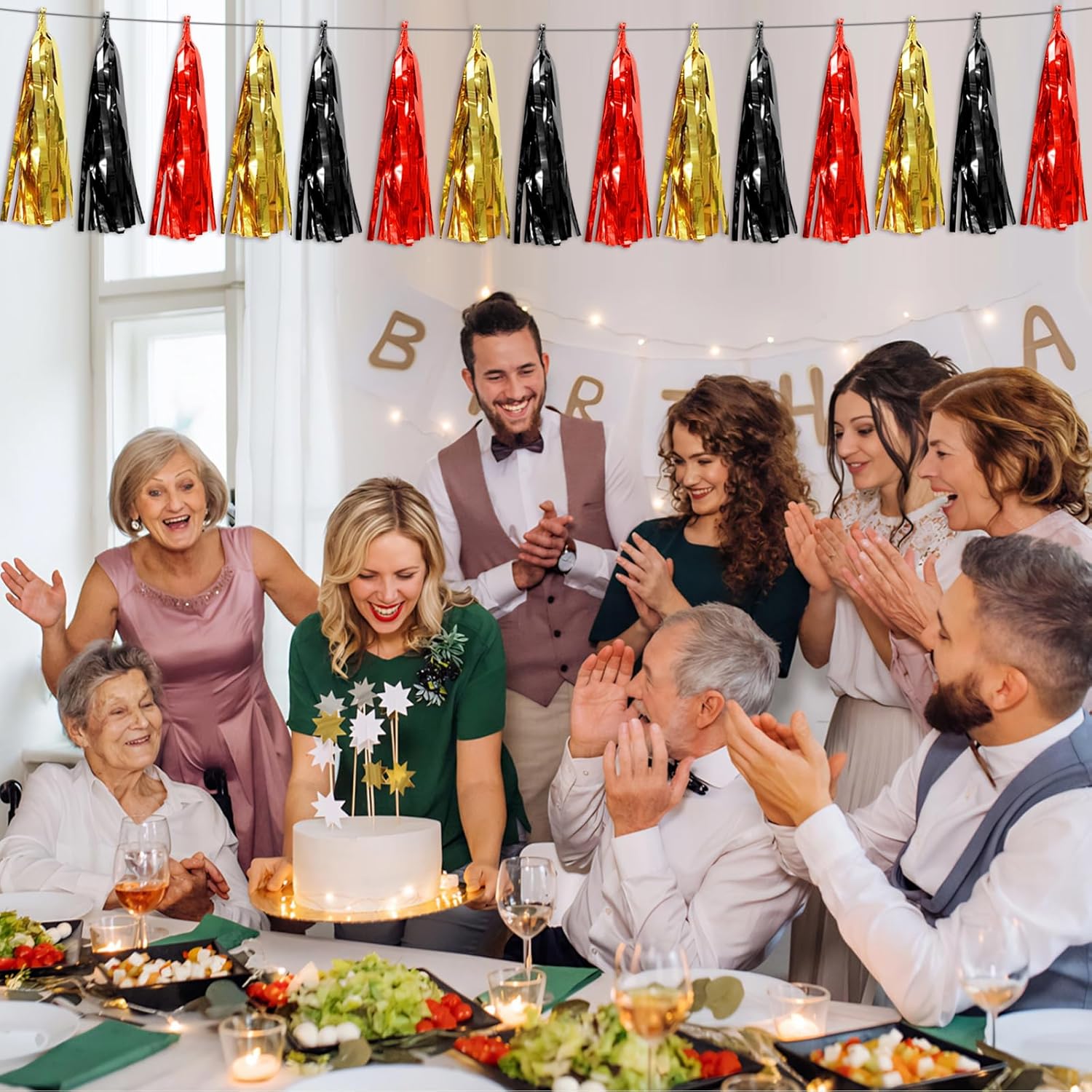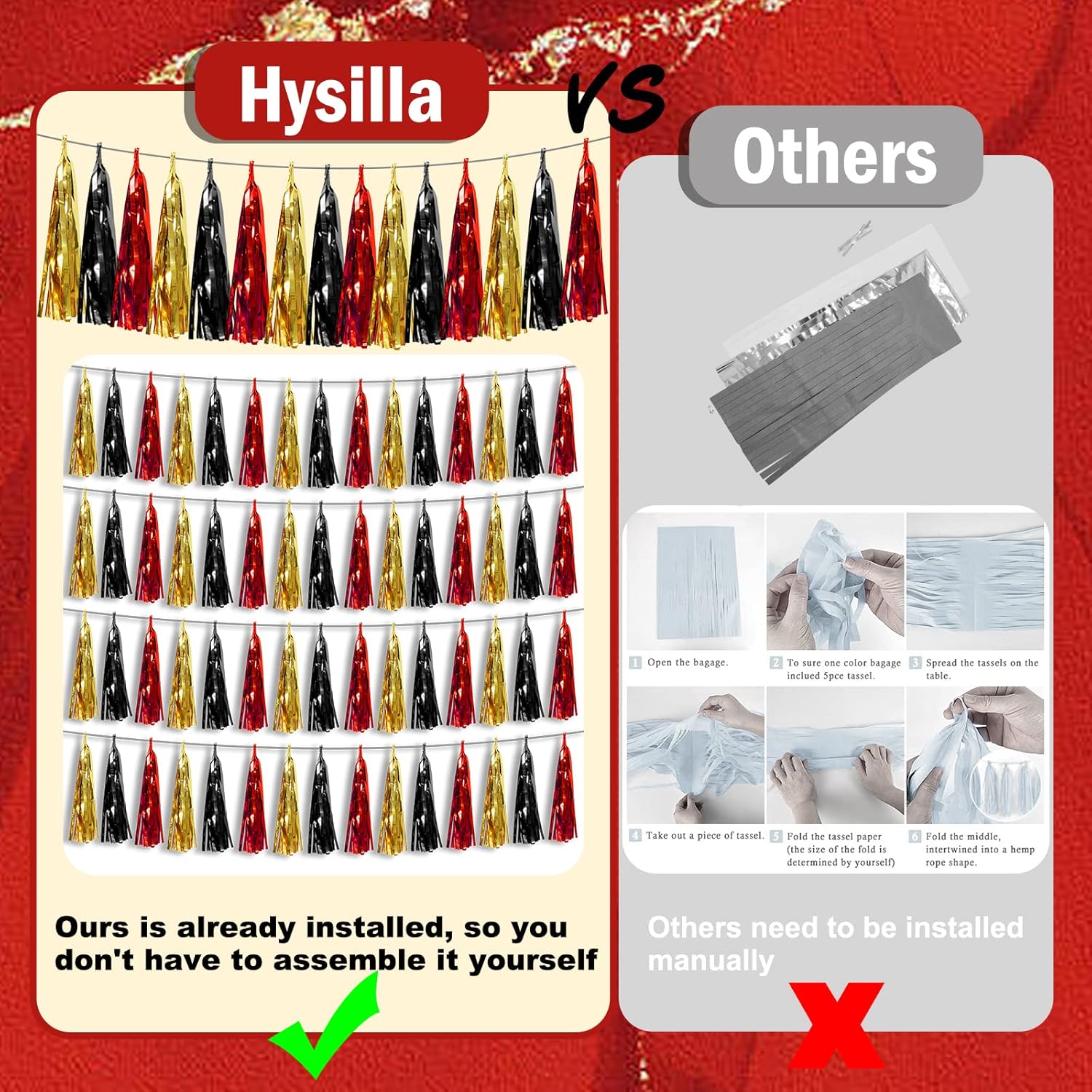 - 【Perfect Party Decoration】The black red gold tinsel garlands are designed in a metallic Fringe, bright, and beautiful, at the same time, they shine in the sun, and these gorgeous tassel garlands create a wonderful backdrop or centerpiece for your party space. and bring you, your family, and your friend's good Visual effects. your party many emotional and touching moments where a lot of pictures will be taken and everybody will have a wonderful time together.