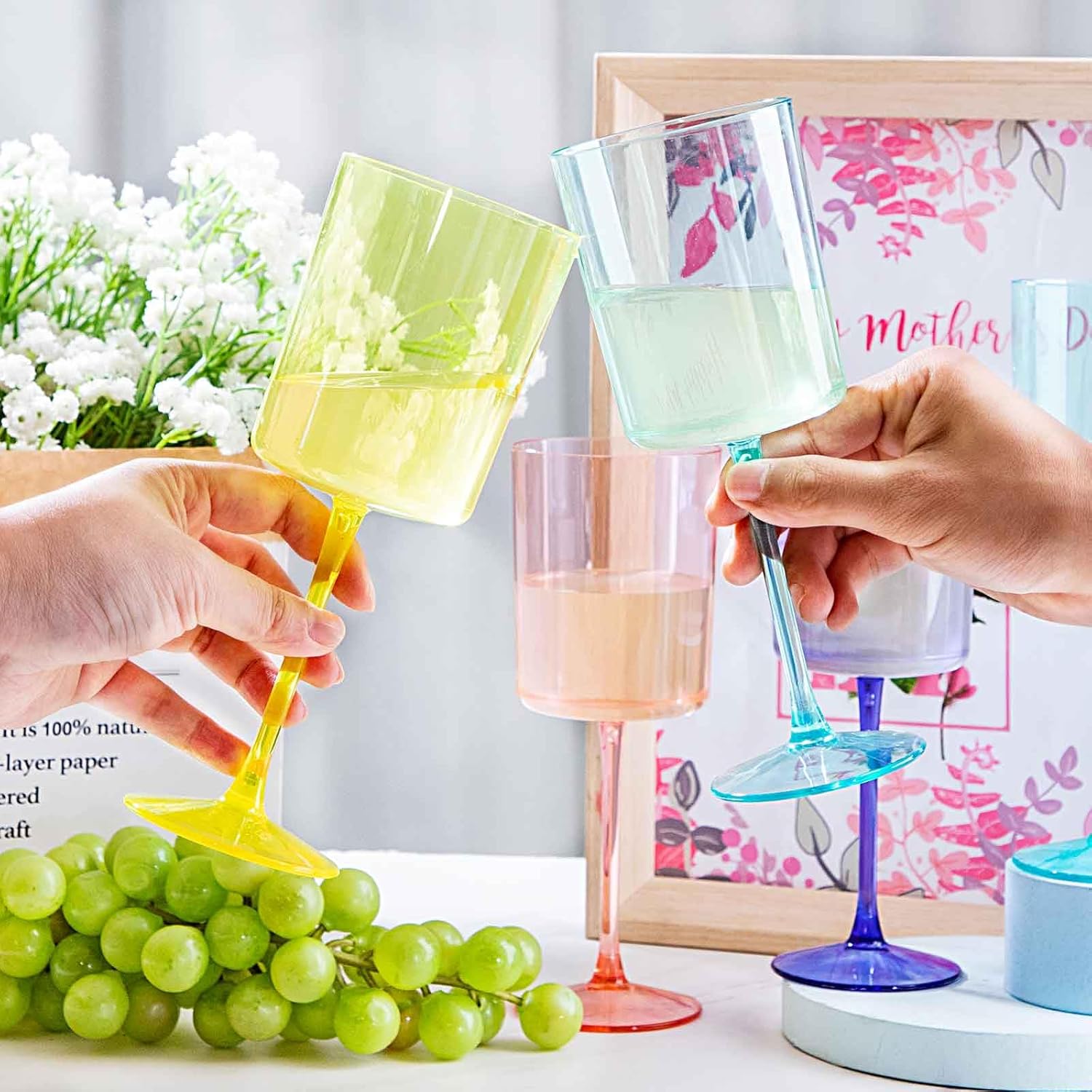 - 🥂Cost Savings:These colorful plastic wine glasses support recycling and reuse, you can also choose to just throw them away after the party, and if you break these plastic wine cups, the cost of losing them is definitely lower than glass glasses.