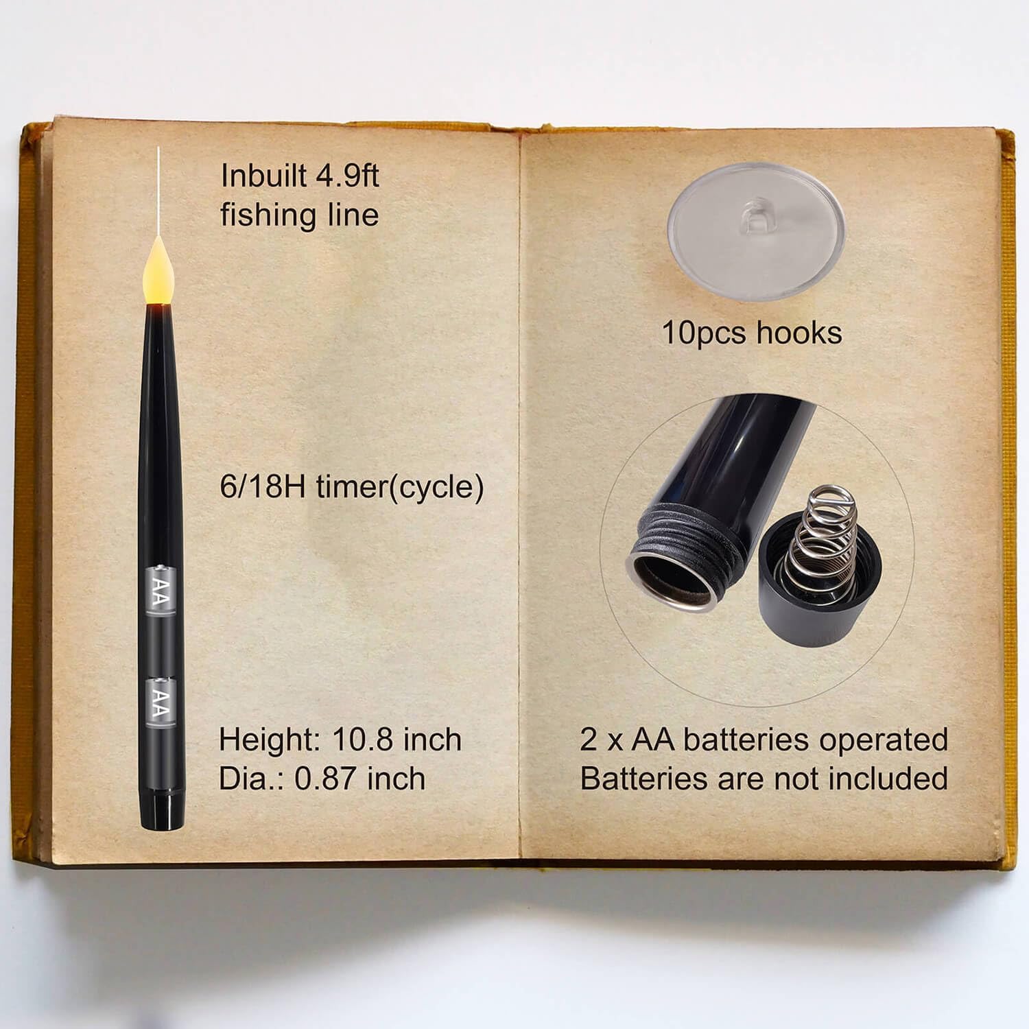 - Package: Each set contains 10 pieces of 0.87"(D)Ă—10.8"(H) LED black candles, 1 plastic magic wand remote control of 14 inches in length, 1 user manual and 10pcs of stick hooks.
