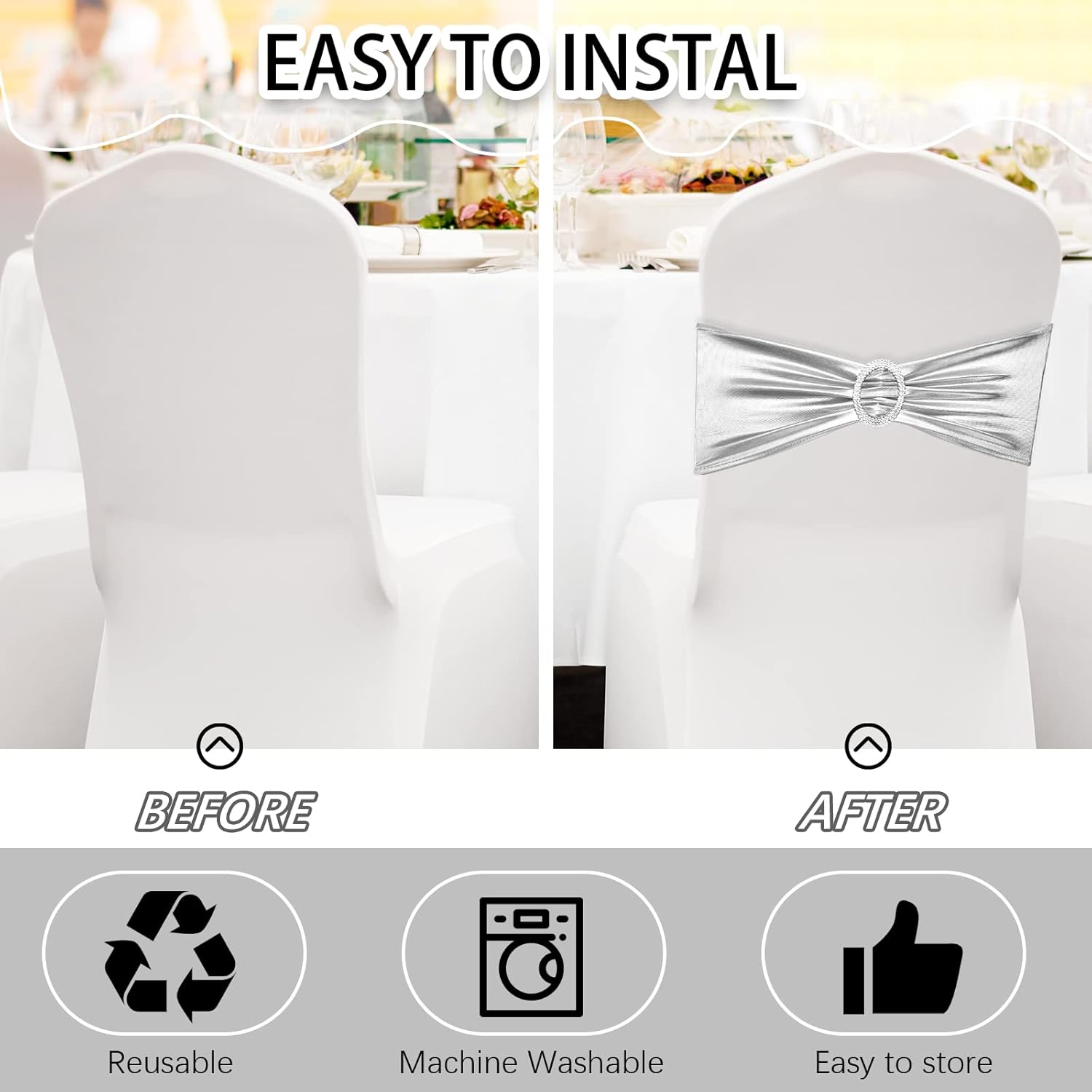 CHENGU 150 Pieces Spandex Stretch Chair Sashes Bows Elastic Chair Cover Bands Ties with Buckle Slider for Wedding Party Reception Events Universal Ceremony Banquet Decorations (Silver)