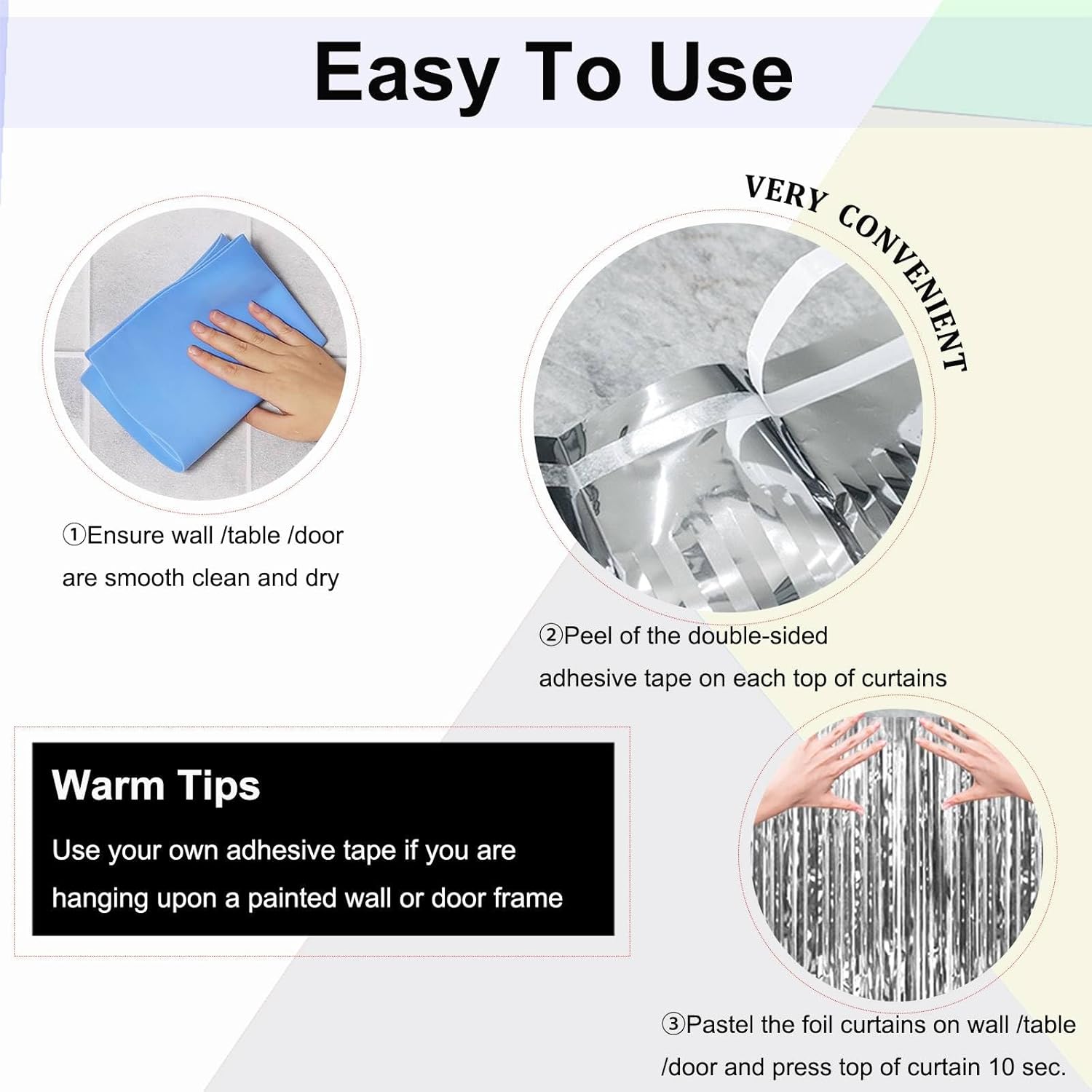 - EASY TO USE: Create a warm and inviting atmosphere in your home with just two simple steps. Step 1: Tear off the back of the double-sided adhesive tape. Step 2: Paste the foil curtain on the wall, door or table to decorate your silver party.