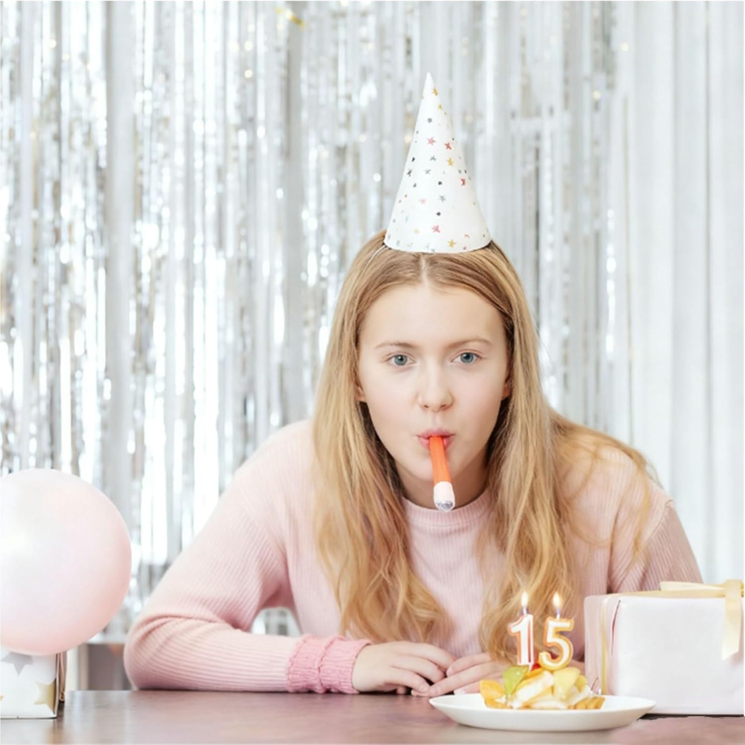 - SILVER BACKDROP: Make your party shine with 4 packs of silver foil fringe backdrop curtains. Each metallic tinsel curtain is 3.2ft (wide) x 8.2ft (drop), perfect to fit most doorways and windows with easy installation.