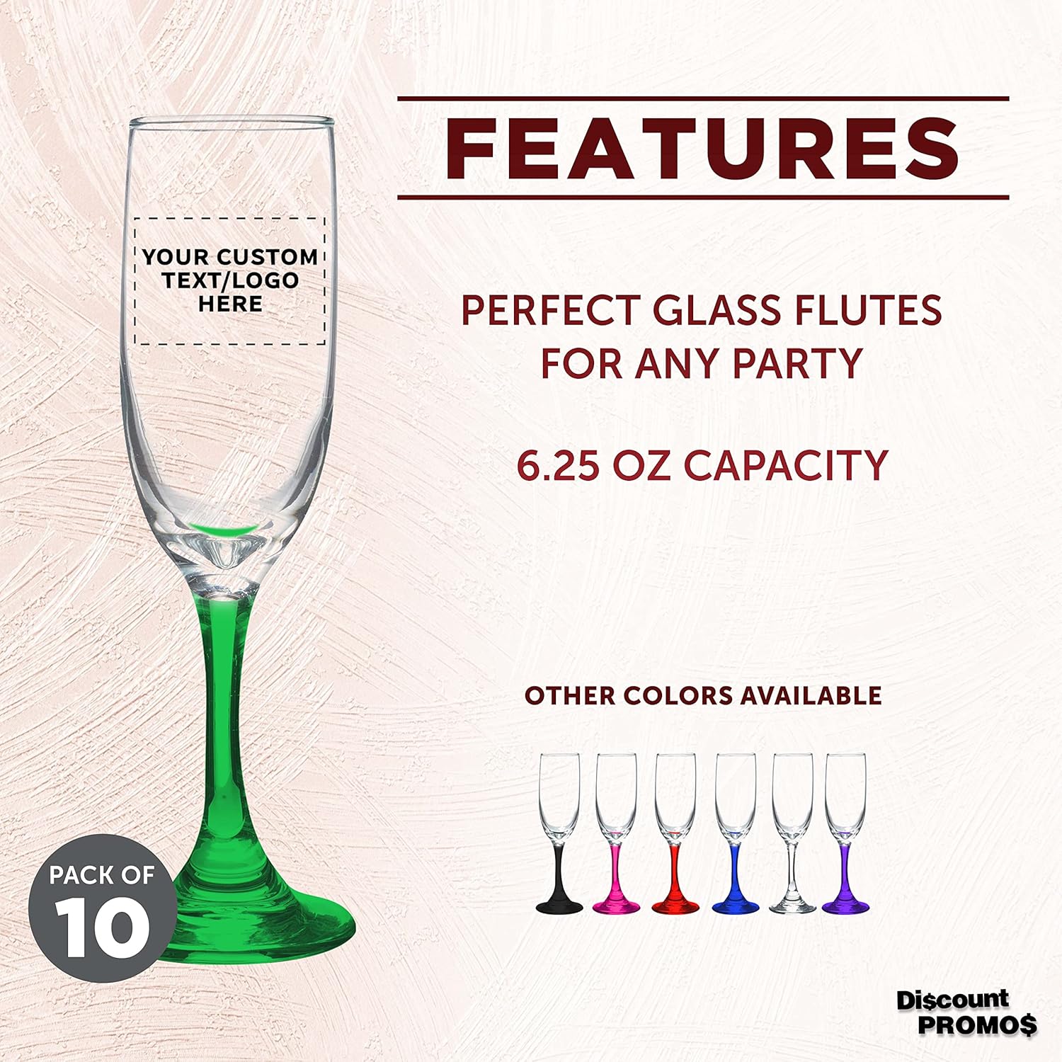 DISCOUNT PROMOS Custom Premiere Champagne Flutes 6.25 oz. Set of 10, Personalized Bulk Pack - Elegant Drinkware for Weddings, Events, & Promotional Gifts - Green