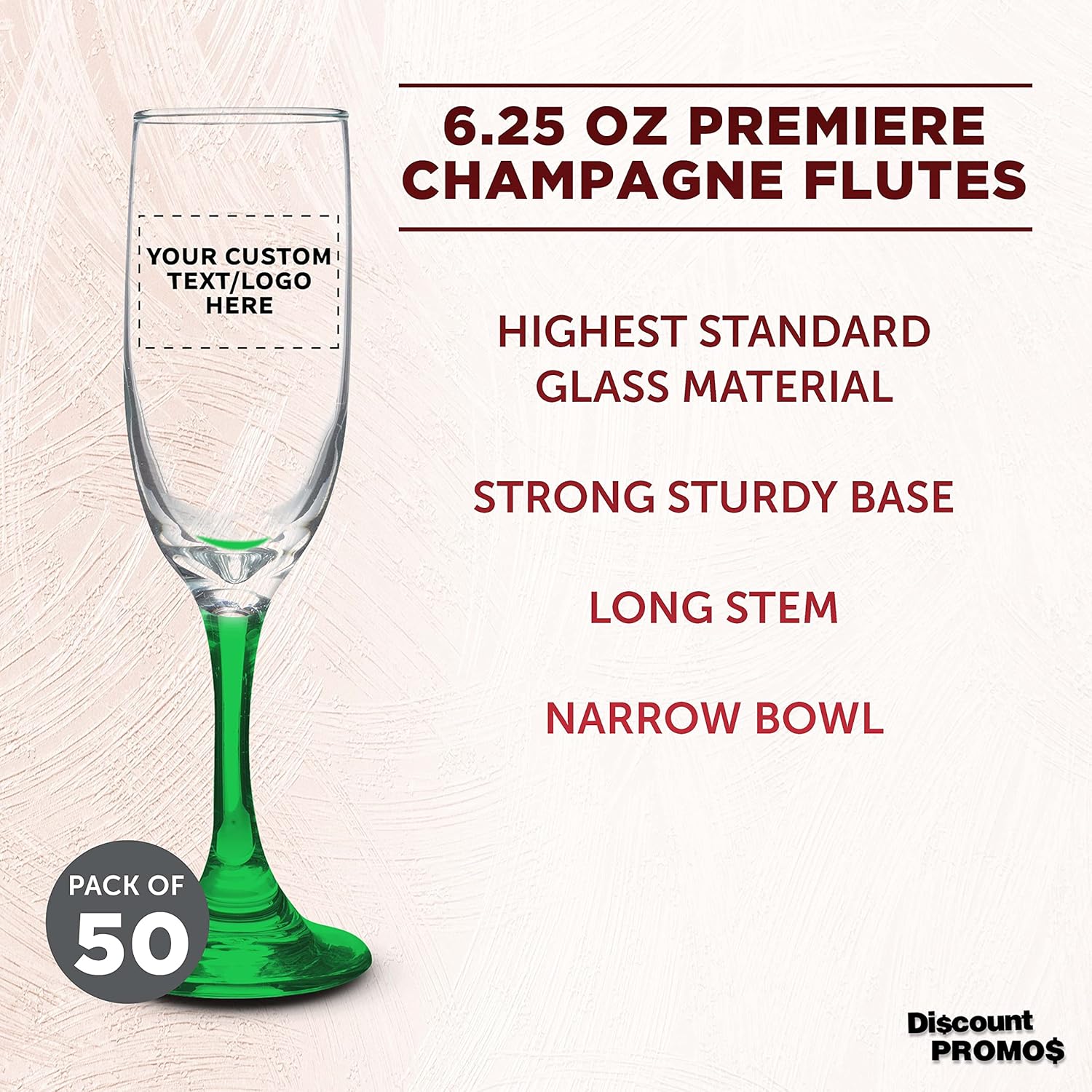 DISCOUNT PROMOS Custom Premiere Champagne Flutes 6.25 oz. Set of 50, Personalized Bulk Pack - Elegant Drinkware for Weddings, Events, & Promotional Gifts - Green