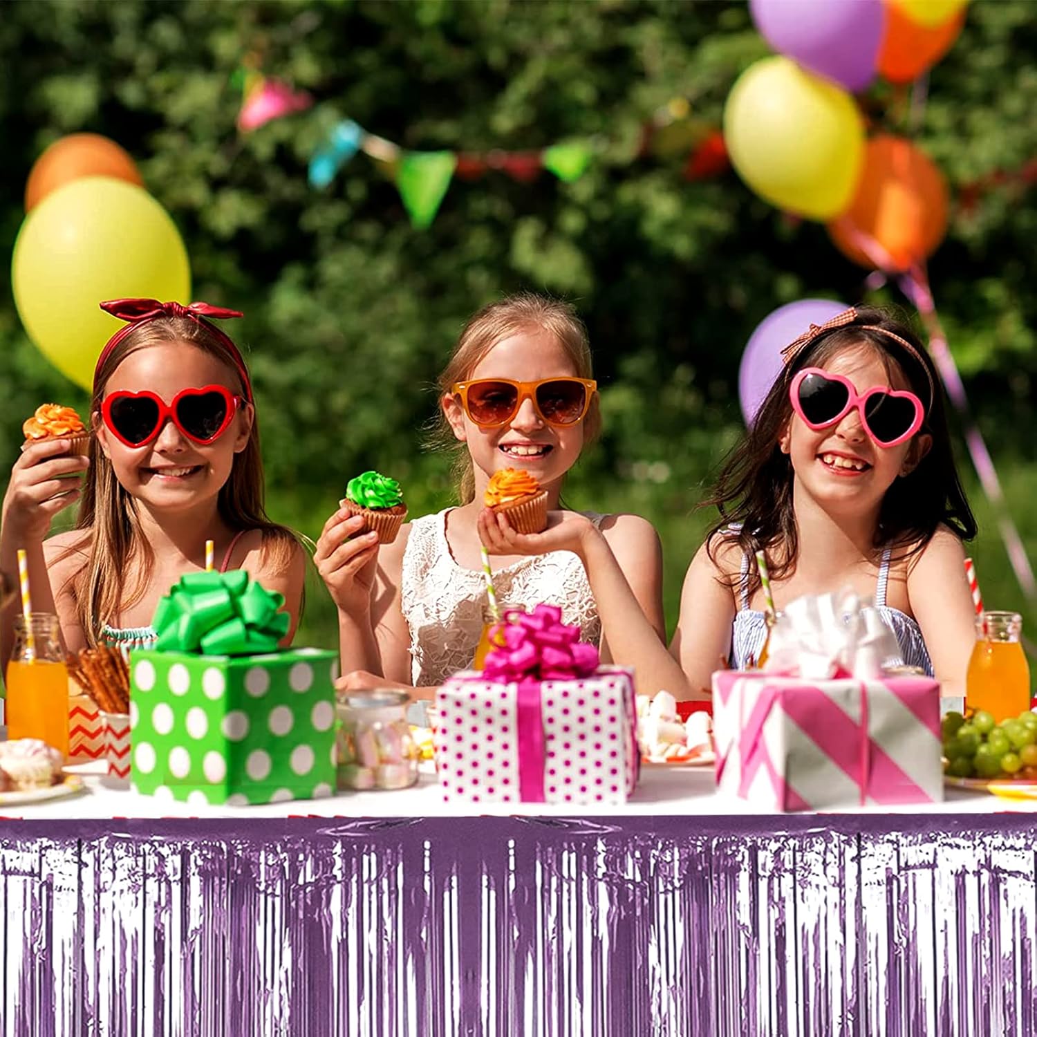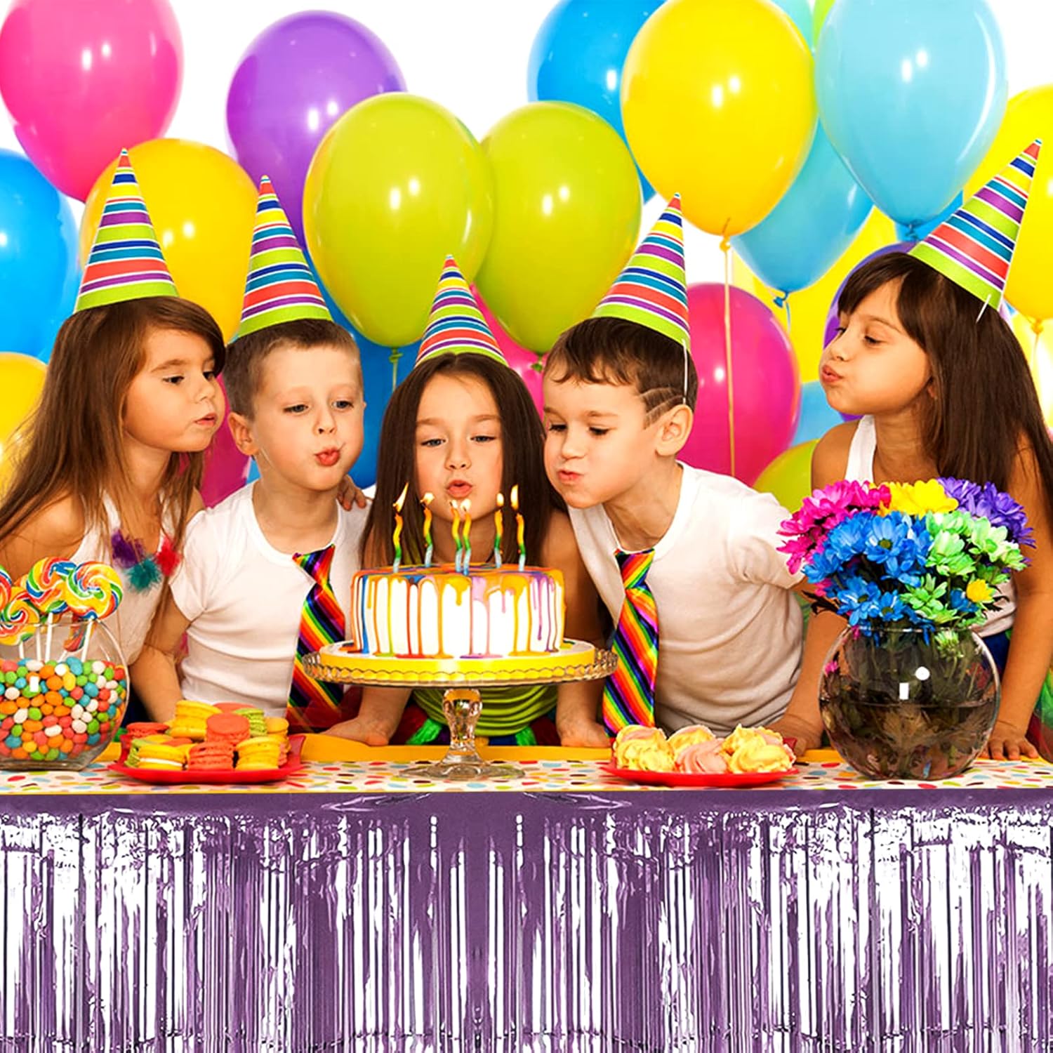 4 Pack 29x108 Inch Metallic Foil Fringe Tinsel Table Skirts for Rectangle Tables Streamer Backdrop for Wedding, Birthday, Parade Floats, Christmas, Halloween Party Decoration(New Light Purple)