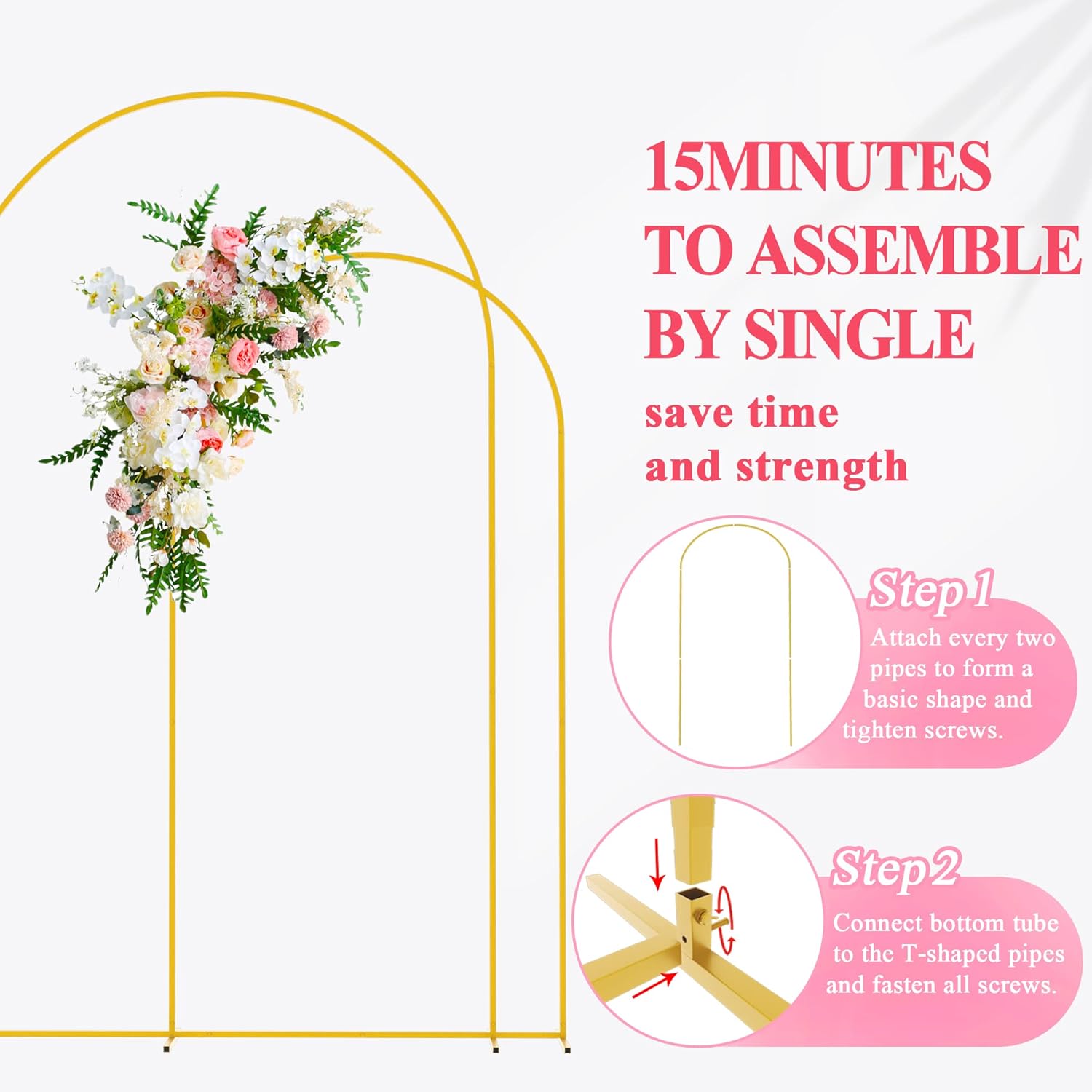 - 【Easy Assembly】Metal wedding arch stand can be quickly assembled with screws in minutes. Portable to space it anywhere at your will. Gold metal square wedding arch backdrop stand would be a graceful archway in your party event or garden.
