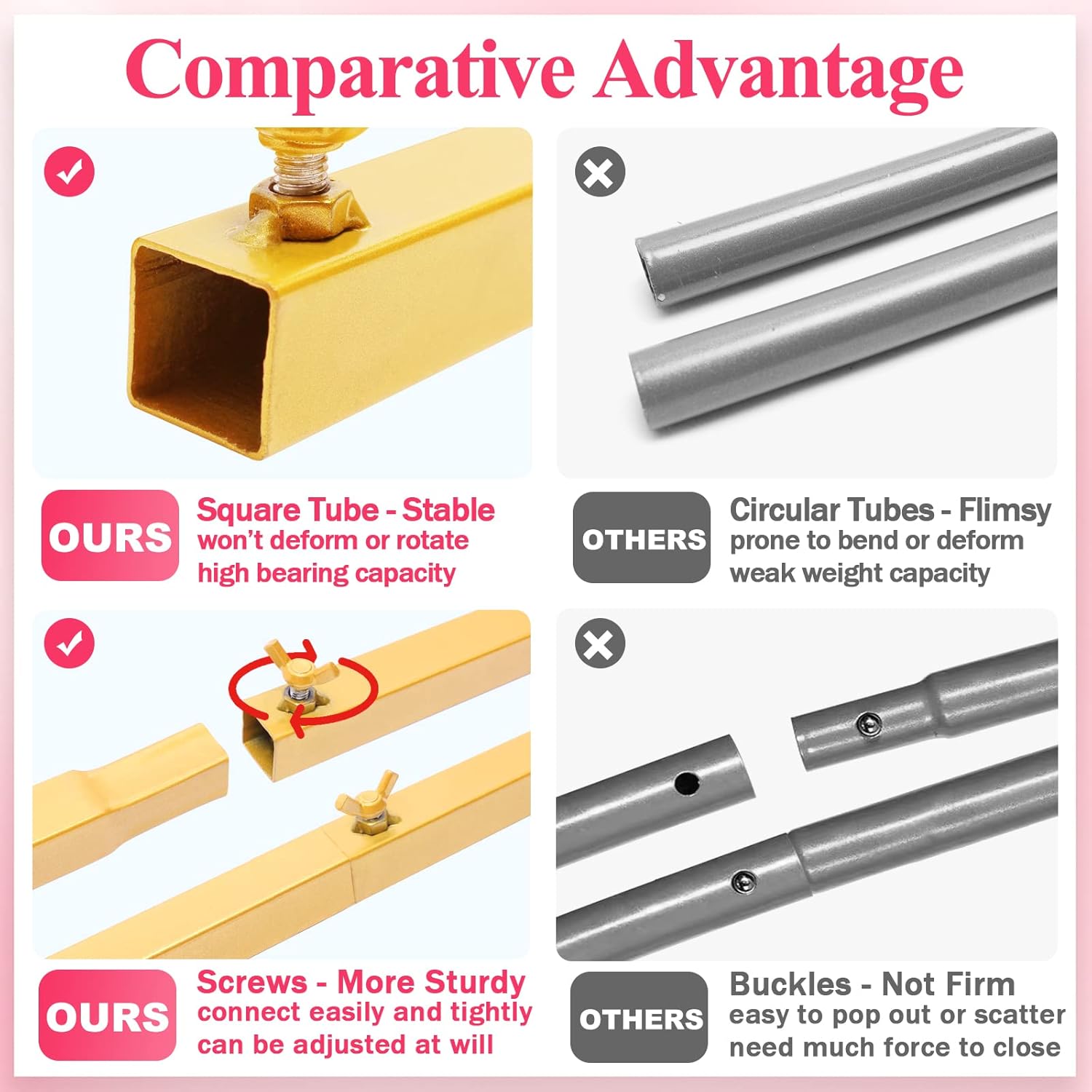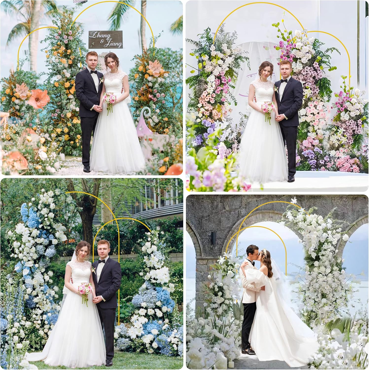 - 【Stable Base with Crossbar】Metal arch stand with a cross bar on the base making the metal gold wedding arch backdrop stand more stable. Adding some decorative elements to the base can also increase stability. Decorate square wedding arch with flowers, greenery, garlands, tulle swags or vines to make your event stand out.