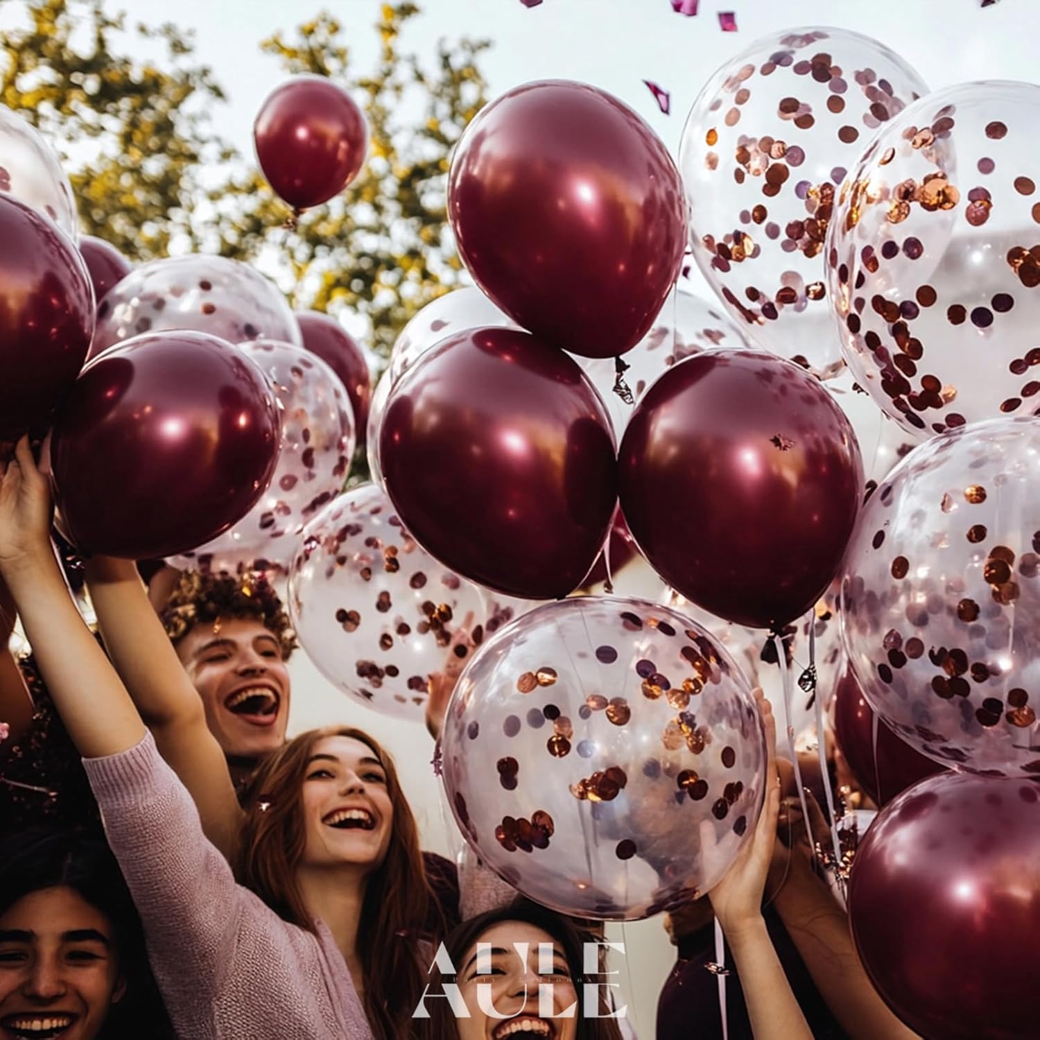 AULE Party Balloons Pack of 42 - Metallic Burgundy Balloons and Confetti Latex Helium Balloons With 64ft Ribbons - 12 Inch Mroon Chrome Balloon Decoration Set