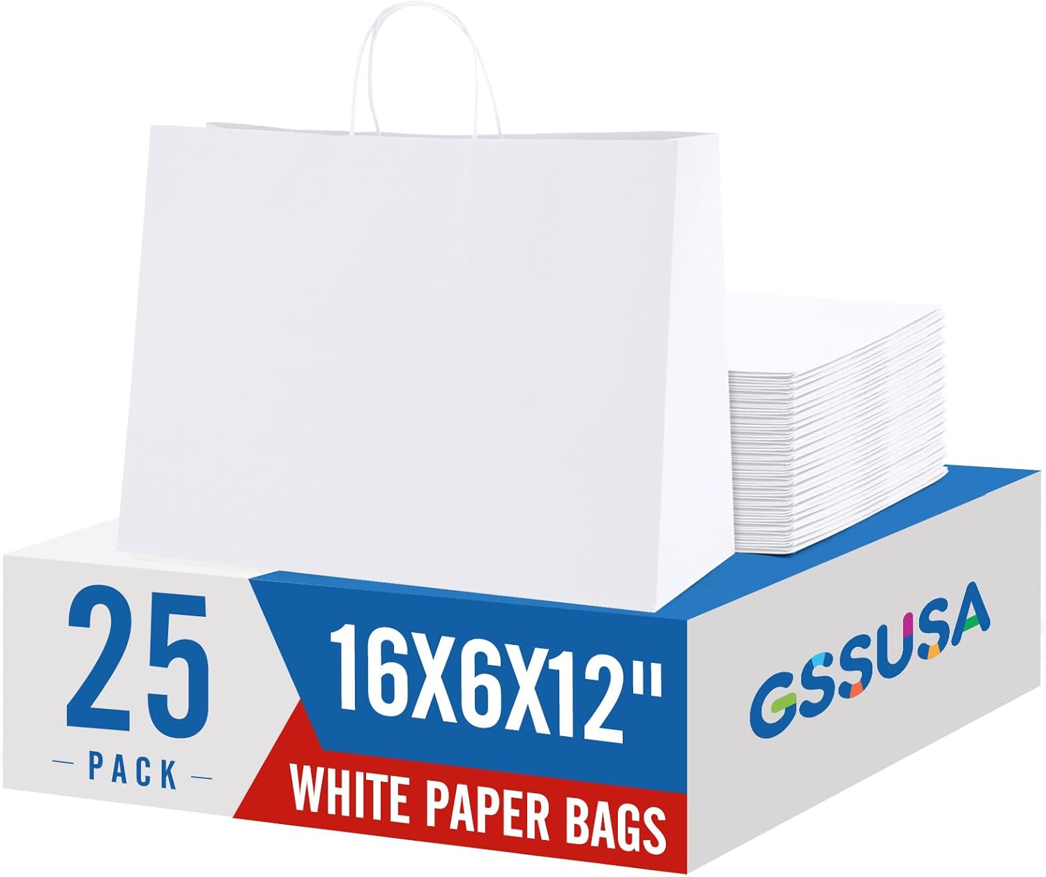 GSSUSA Large Paper Gift Bags 16x6x12'' 25Pcs White Paper Bags with Handles, Shopping Bag for Small Business, Sturdy Kraft Paper, for Boutique, Party Favor Bag, Valentine's Day Craft
