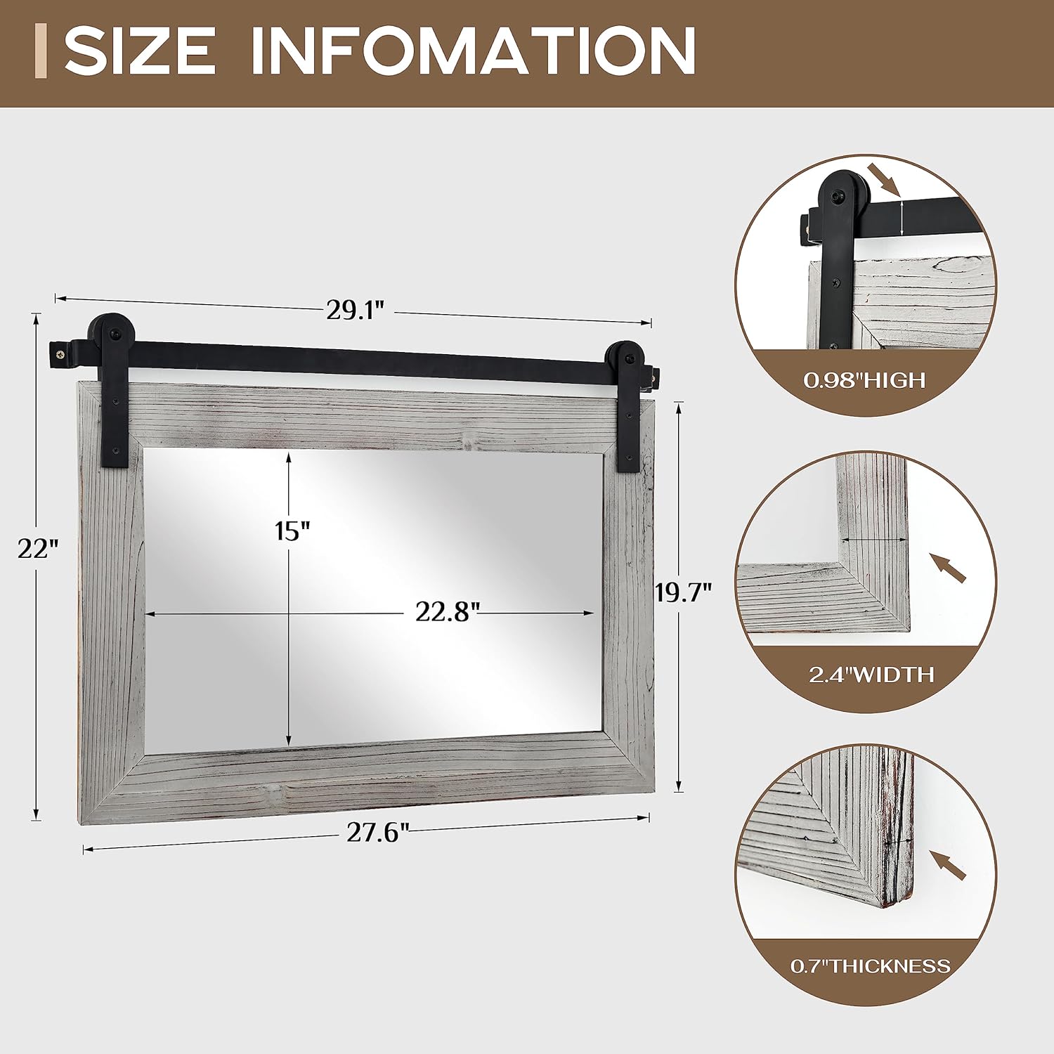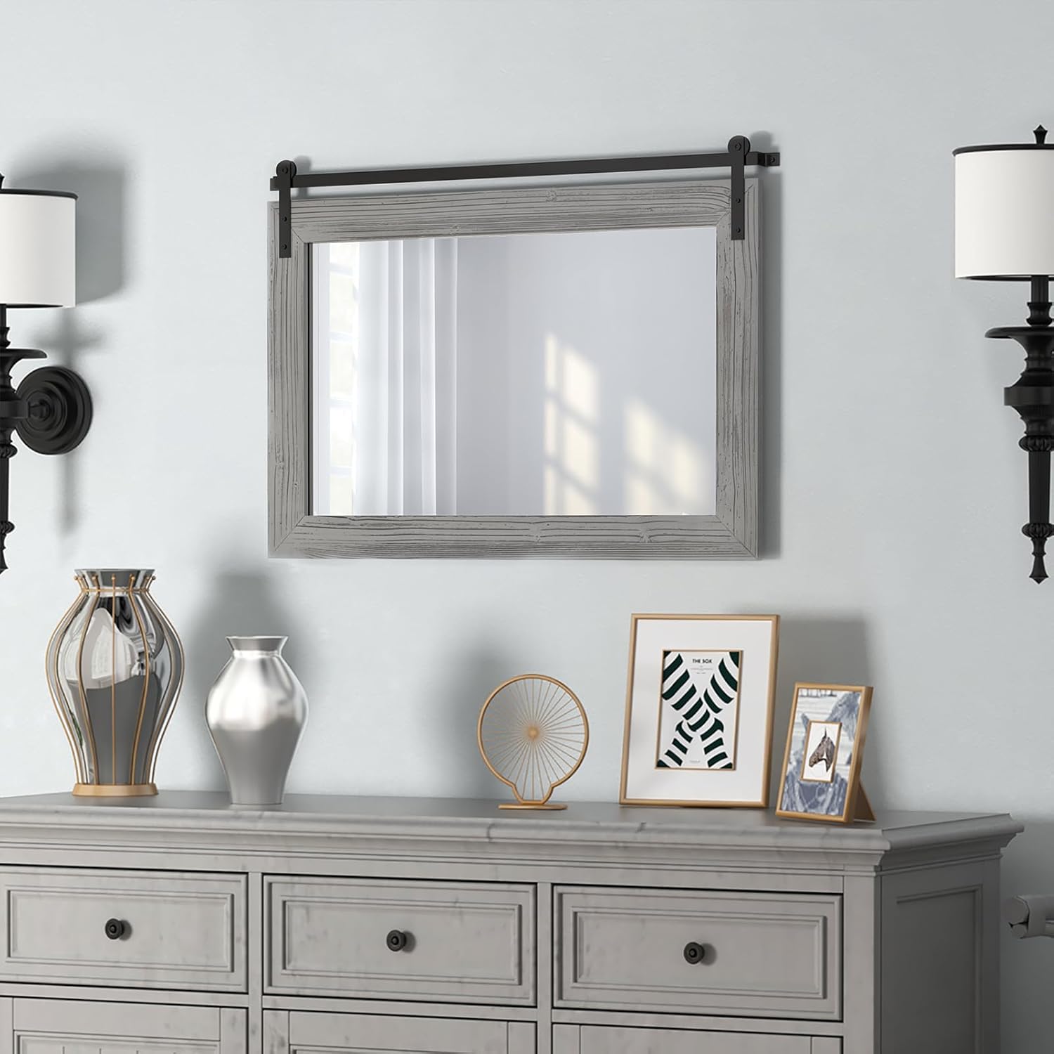 COGOOD Farmhouse Barn Door Mirror - 29" x 22" Rustic Wood Framed Wall Mirror for Bathroom, Living Room, Entryway Wall Decor (Grey)