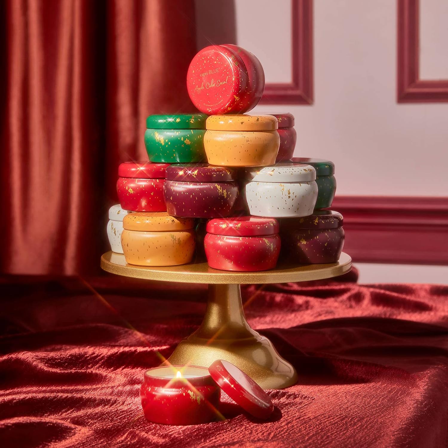 - Apple Cider Social Glimmer Mini Tin Jar Candle (3 oz): Our favorite stocking stuffers will be the talk of all holiday parties this year. These tins pack a punch and are the perfect gift for anyone on your list! Our Apple Cider Social candle features a stunning cranberry red and metallic foil finish and will give you all the cozy fall feels. Burn Time: Up to 15 hours.
