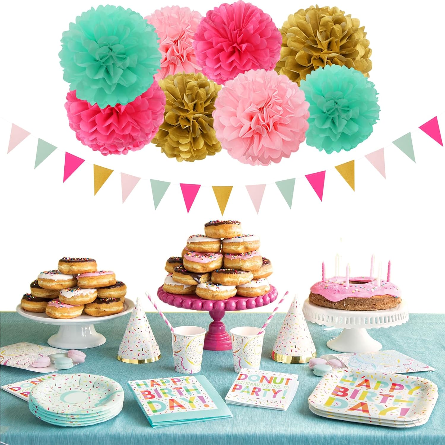 - 【Package Contains】The mint light pink hot pink gold party kits include 8pcs tissue paper flowers: 4pcs 8" and 4pcs 10" in three color, 1pcs Triangle Flags,1pcs circle dots paper garland,20pcs tassel garland. Total 30pcs.