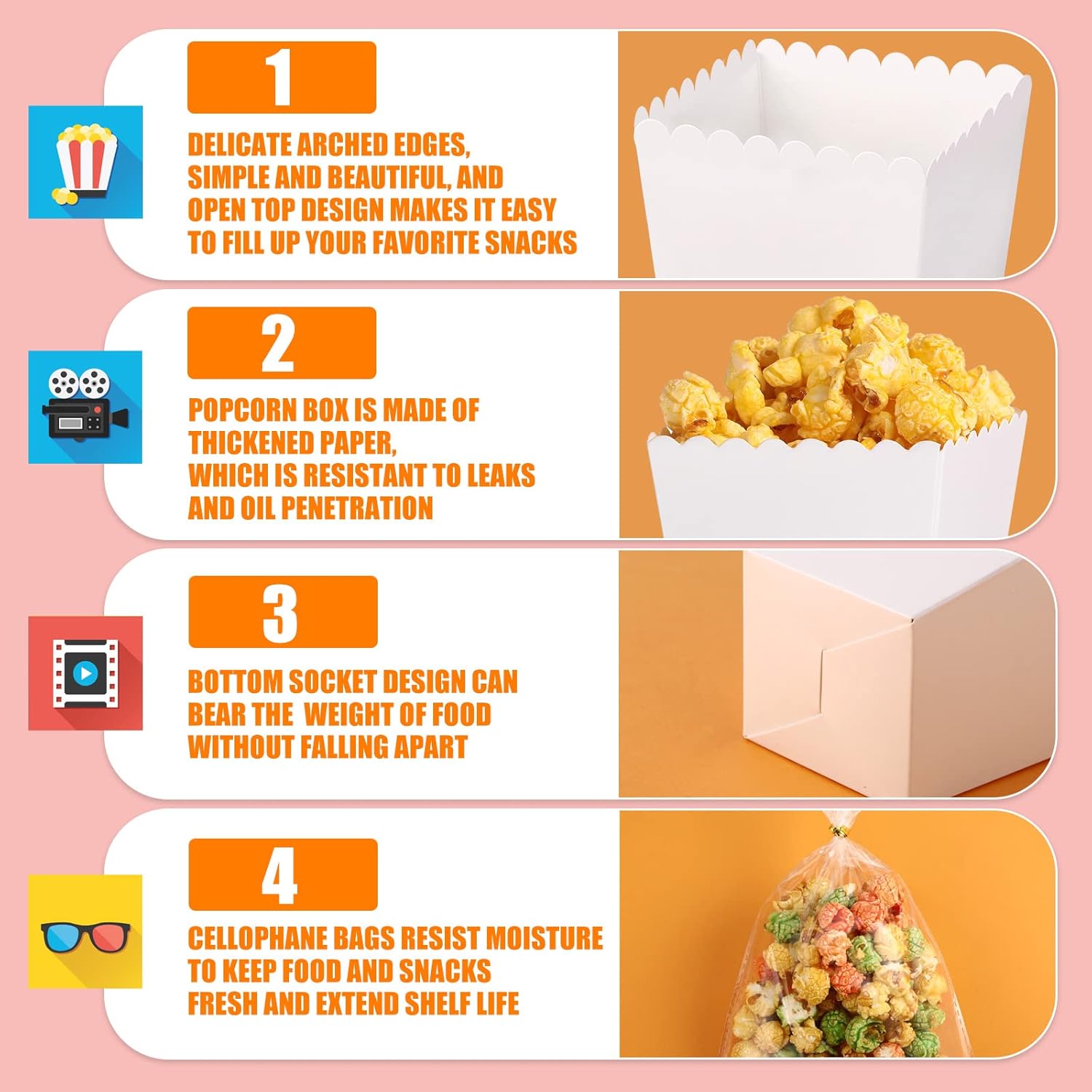 - Quality Materials: made of reliable thickened 300gsm papers, these cardboard containers are reliable and resistant to leaks and oil penetration; The paper popcorn box is flat packed for easy assembly; The cellophane bag is made of quality PP plastic with vapor barrier properties to keep food and snacks fresh and extend shelf life