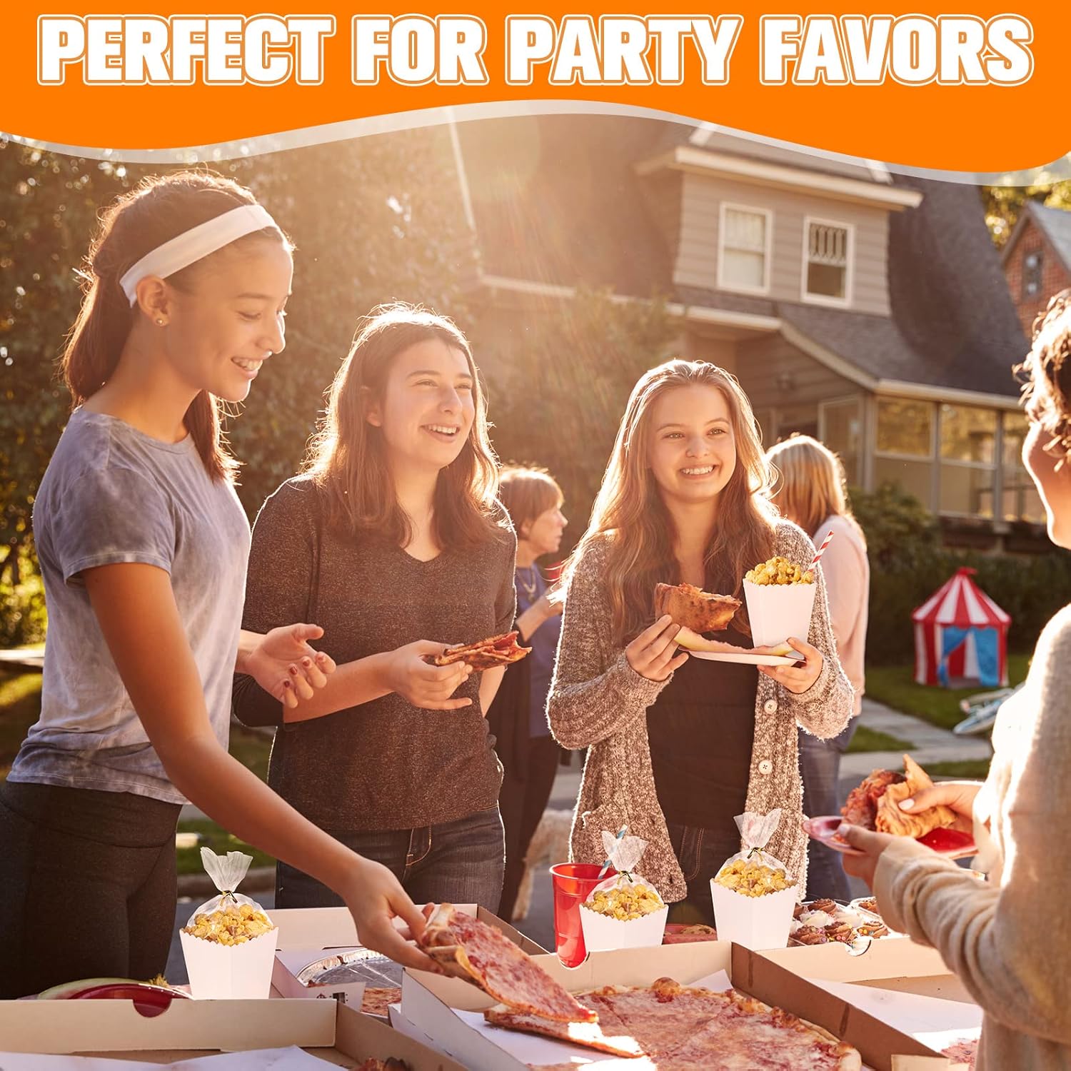 - Convenient Popcorn Favor Box: popcorn boxes open top size 3.15 x 3.15 inch; Bottom size 2.2 x 2.2 inch; Height size 4.3 inch. Clear treat bag measures about 6 x 10 inches, perfect for holding popcorn, corn flakes candies, cookies for convenient snacking