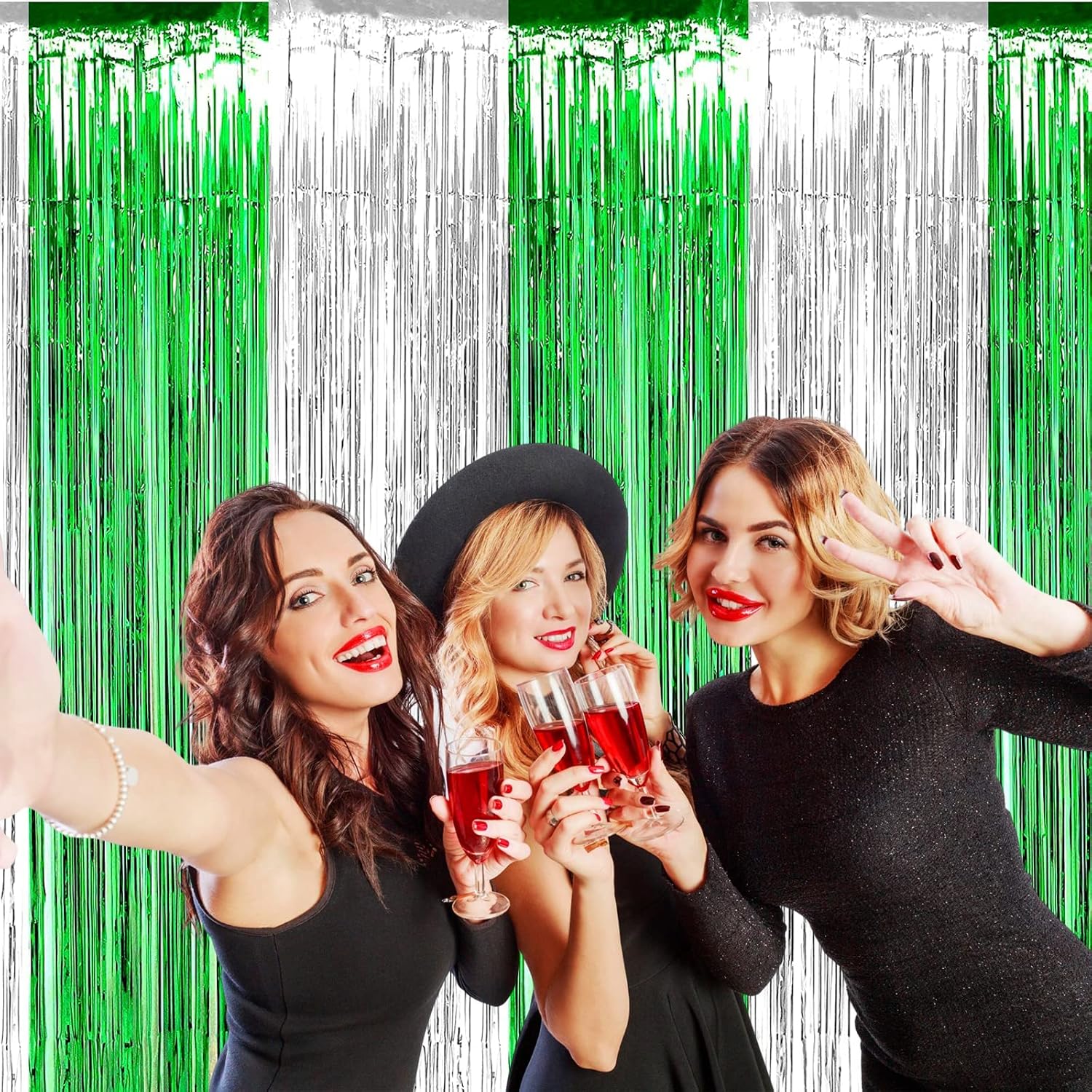 4 Pack Foil Fringe Curtain Backdrop, 3.28Ft x 8.2Ft Metallic Tinsel Foil Fringe Streamers Curtain for Photo Booth, Wedding, Mardi Gras Birthday Carnival St Patrick Day Party Decoration (Silver Green)