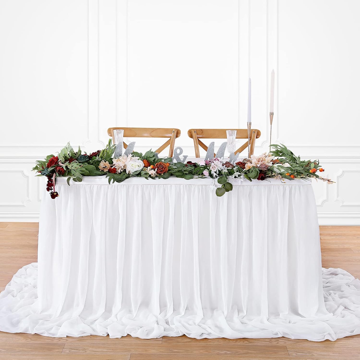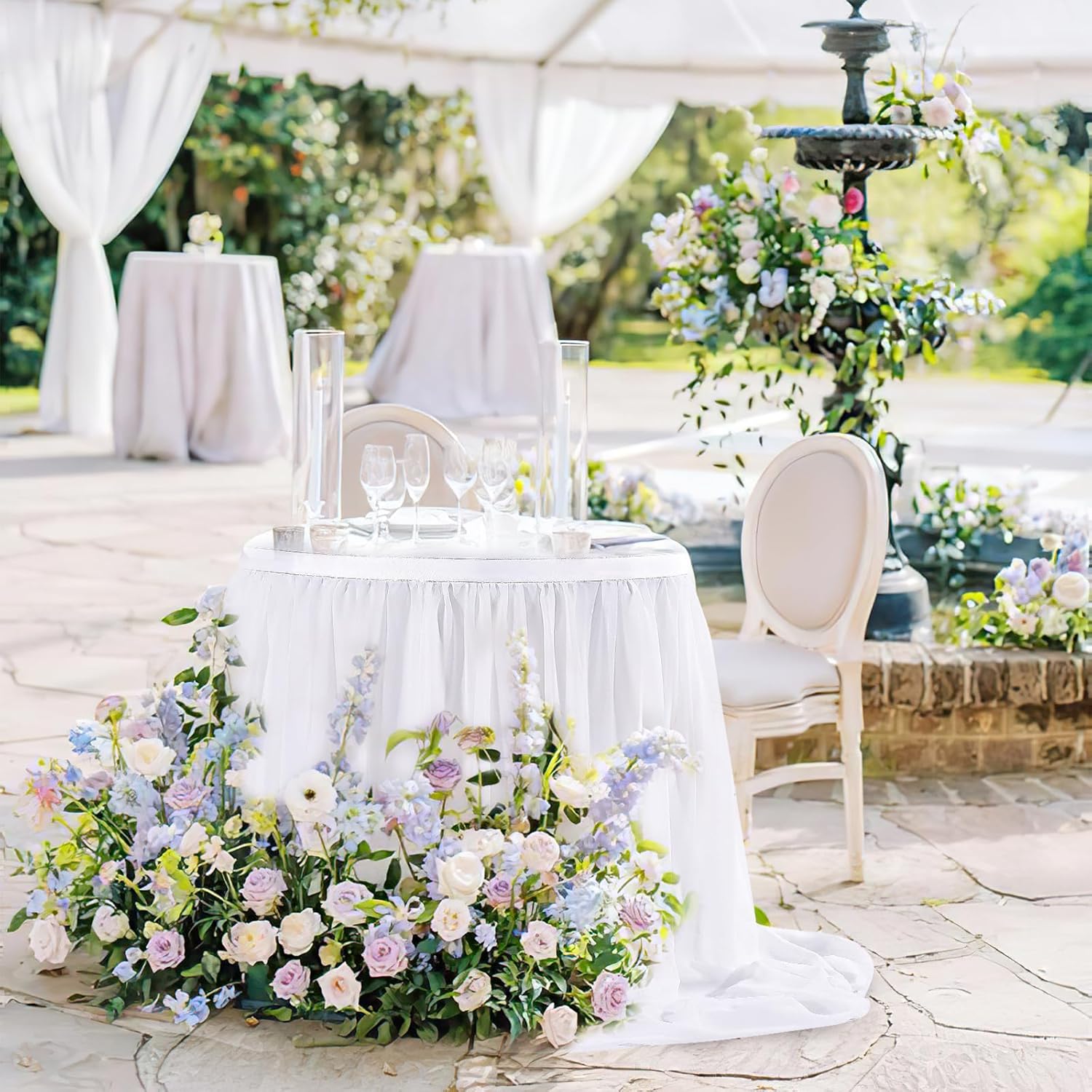 - ๐ก White Table Skirt Material: The extra long chiffon table skirt is made of Sheer Chiffon which is wrinkle-free, soft, and with a nice drapery. Table skirt both robust for kids birthday party supplies and elegant if used for wedding decoration.
