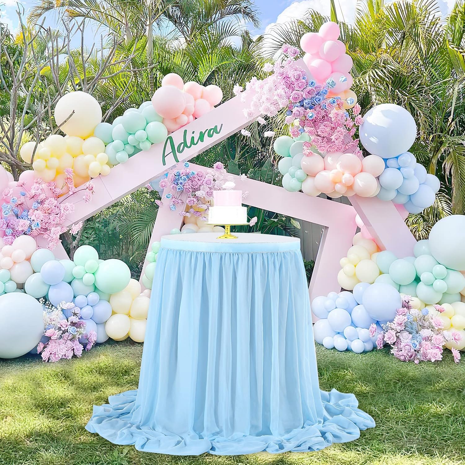 - ๐ก Baby Blue Table Skirt Material: The extra long chiffon table skirt is made of Sheer Chiffon which is wrinkle-free, soft, and with a nice drapery. Table skirt both robust for kids birthday party supplies and elegant if used for wedding decoration.