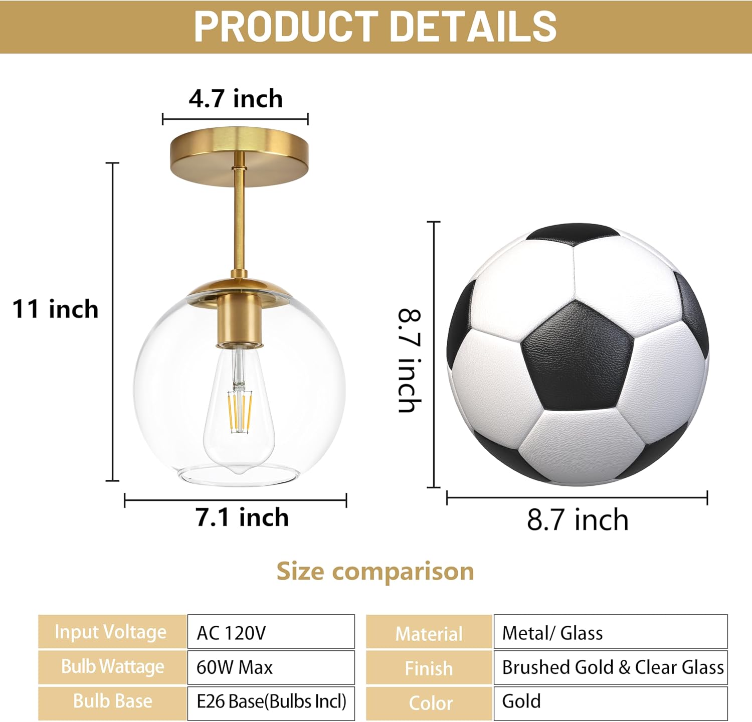 - [ Size & Design ] This ceiling globe lamp has a height of 11inch, a width of 7.08inch and a ceiling plate of 4.7inch.The classic mid-century modern style is both elegant and stylish. The gold finish and clear glass shade create the perfect ambiance while illuminating the room with a twist