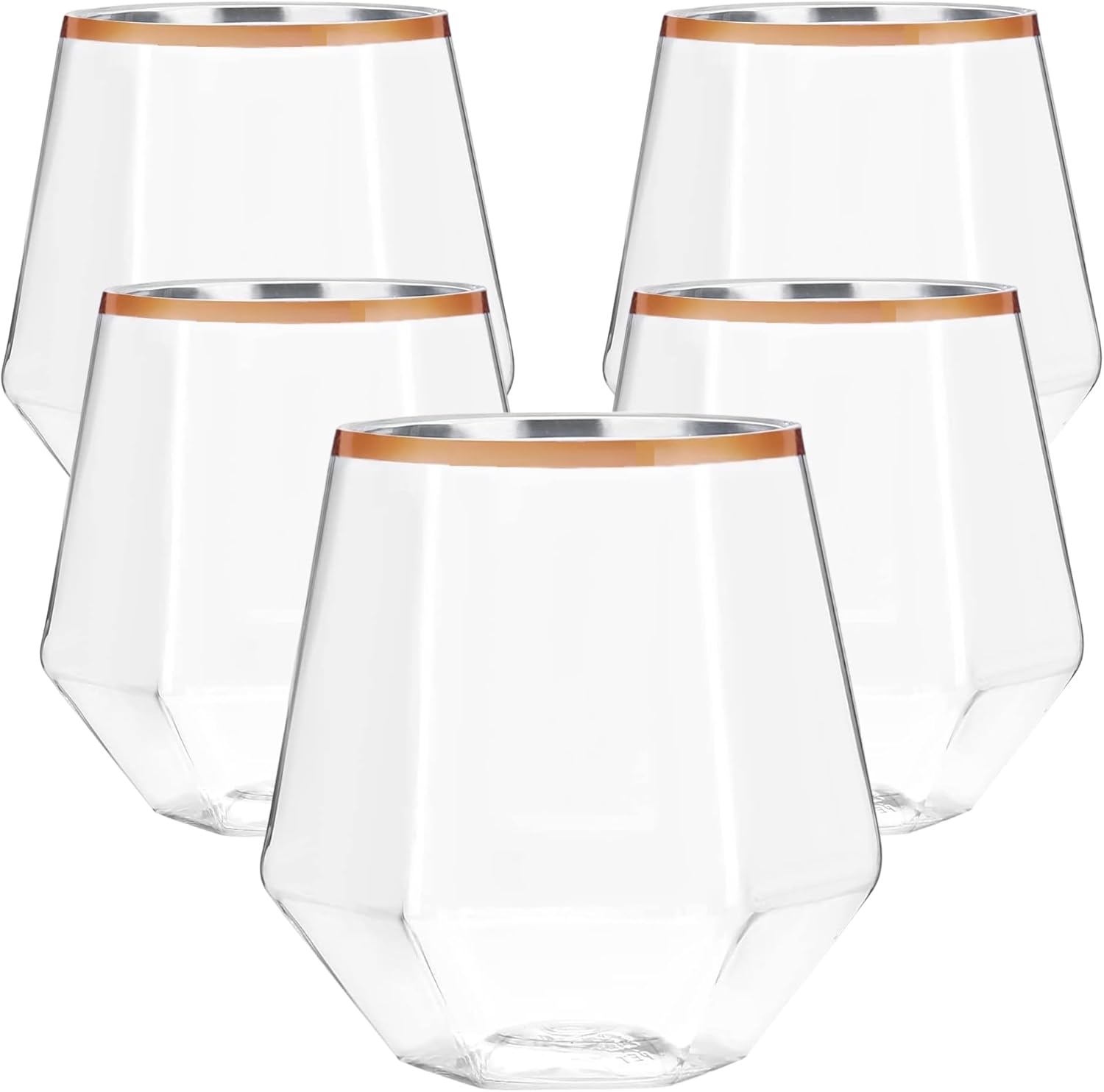 40 count Diamond Unbreakable Stemless Plastic Wine Champagne Whiskey Glasses Elegant Durable Disposable Indoor Outdoor Ideal for Home, Office, Bars, Wedding, 12 Ounce Cups Rose Gold Rim (Rose Gold)